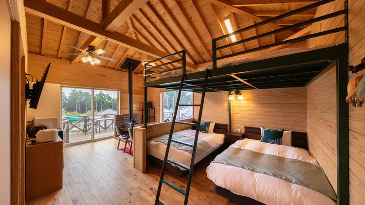 アクティブに過ごしたい方おすすめ■洋室35平米+ロフト寝室+ウッドデッキ21平米+お庭■セミダブル×2台■源泉かけながし檜風呂■ミニキッチン、キッチン用品完備