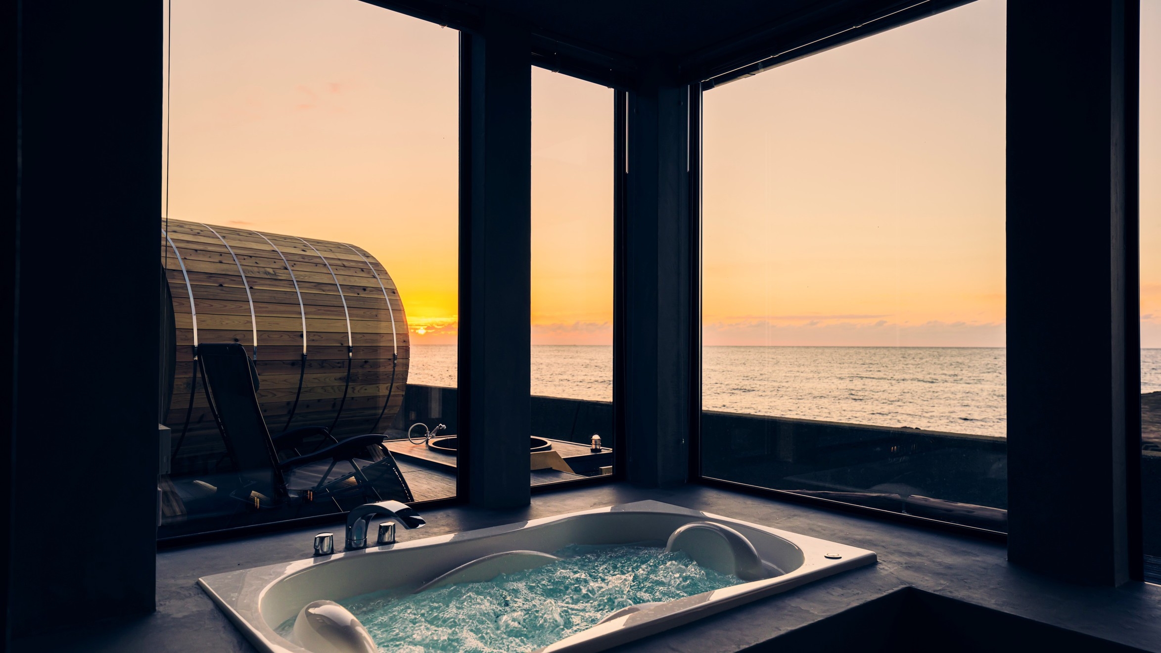 越前海岸を望むプライベートテラスでの極寒外気浴とテントサウナで”解凍体験”をどうぞ。