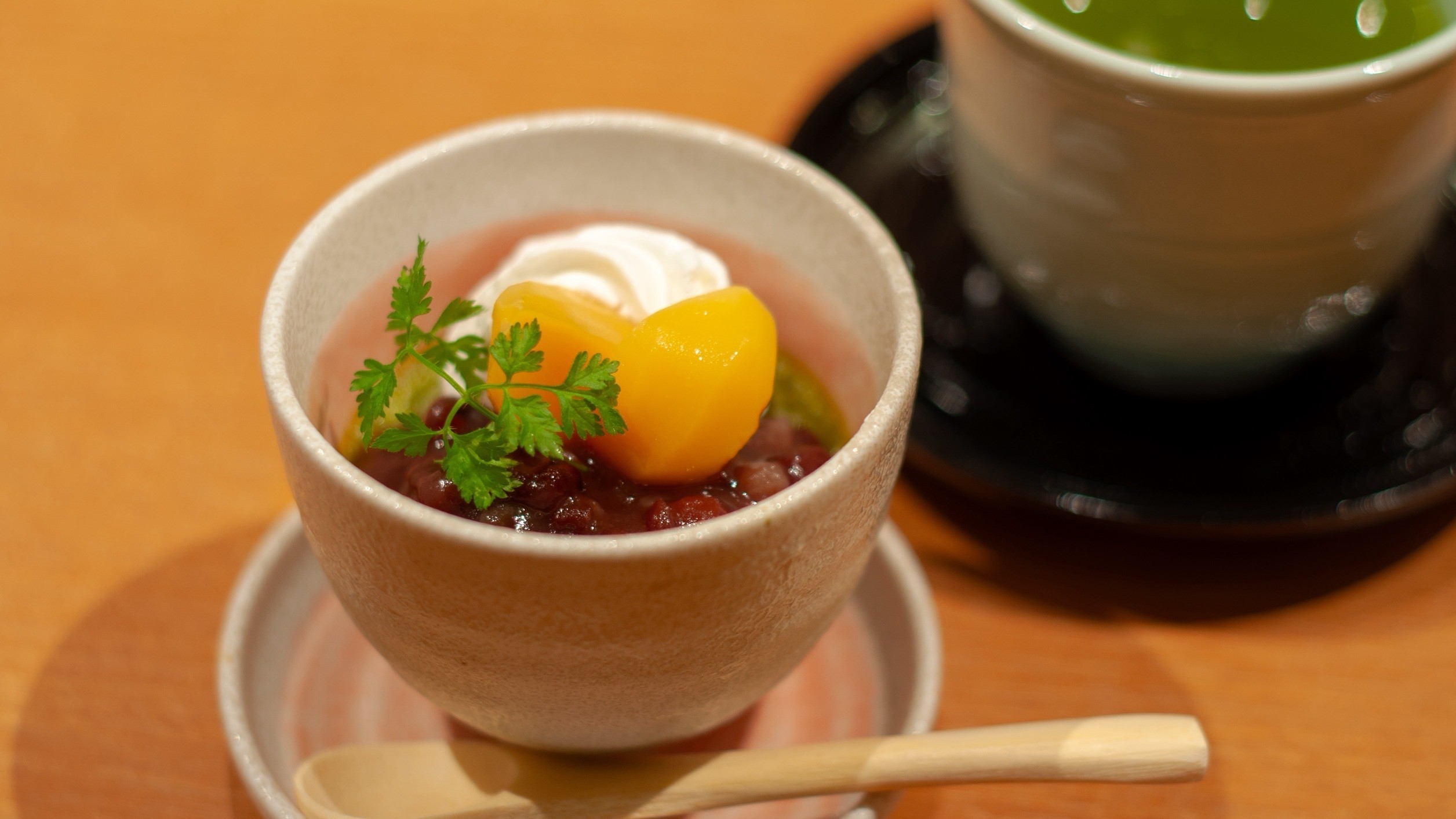 懐かしくも新しい和モダンの内装、天井が高く開放感のある空間が心を癒します。ウェルカムスイーツとして自家製の抹茶プリンをご用意。