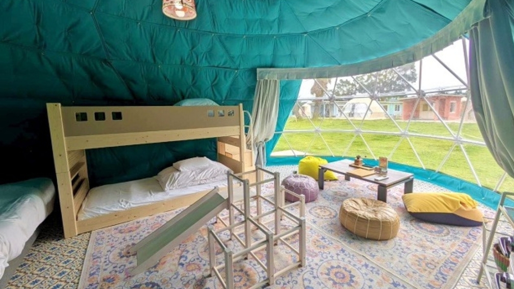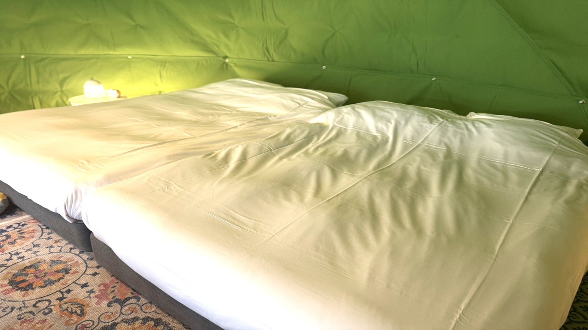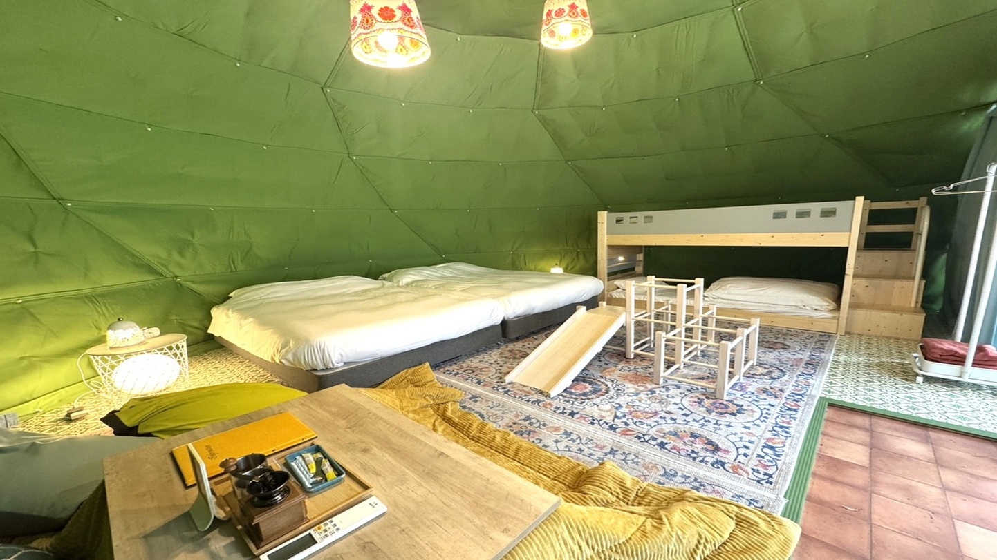 【ダブルベッド×2台 シングル2段ベッド×1台】最大6名様までご宿泊いただけるドームテント! 快適かつ優雅な滞在をお楽しみいただけます。