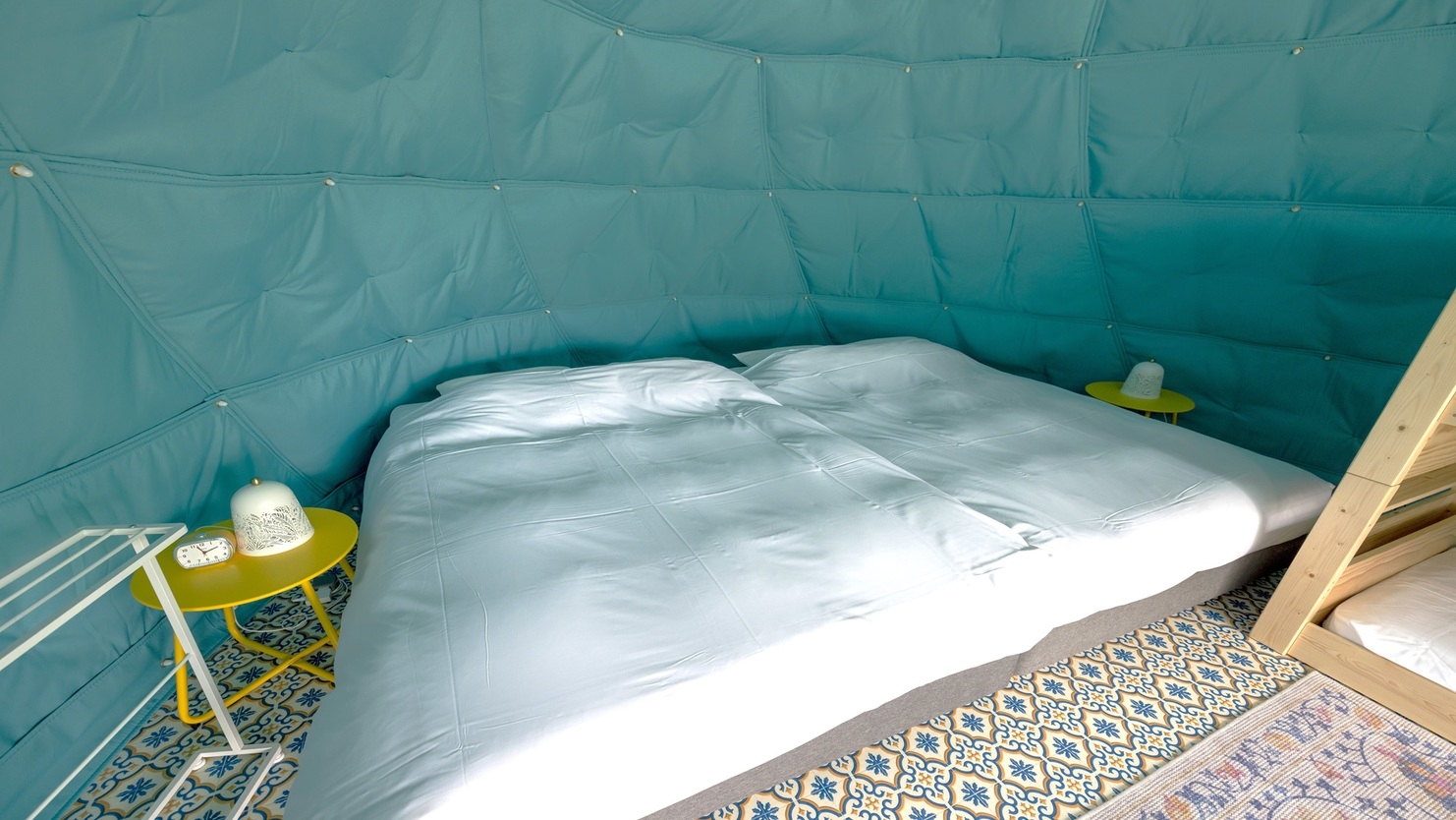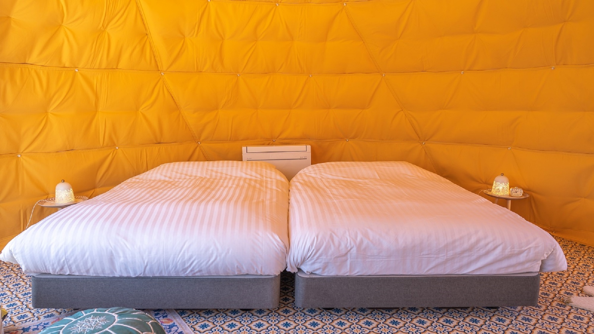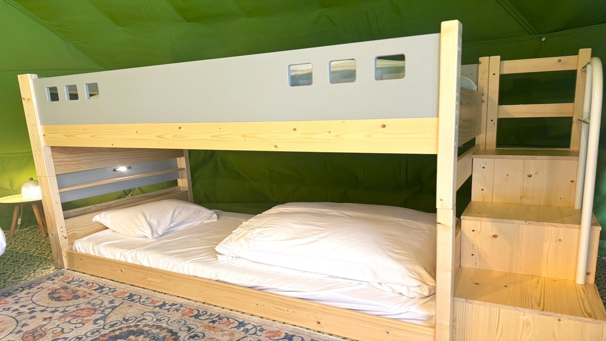 【ダブルベッド×2台 シングル2段ベッド×1台】最大6名様までご宿泊いただけるドームテント! 快適かつ優雅な滞在をお楽しみいただけます。