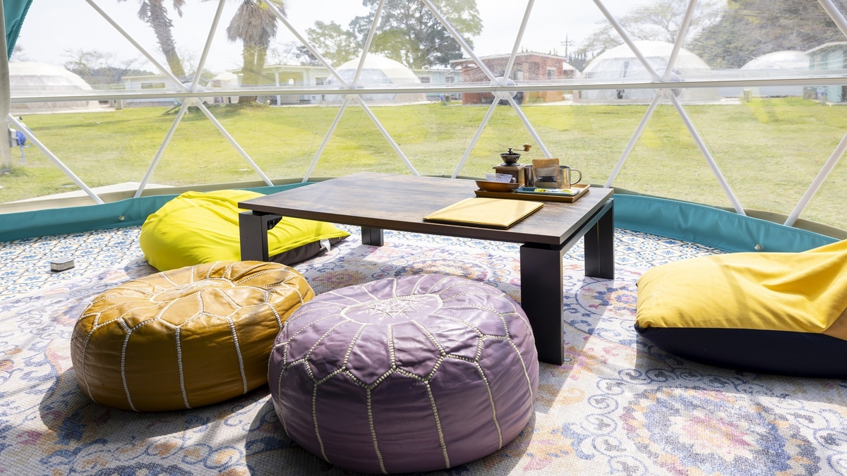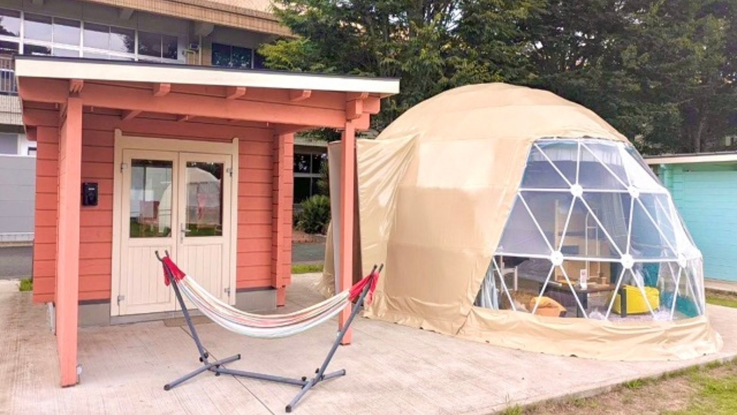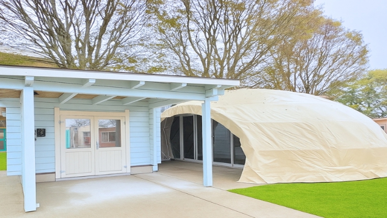 エアコン完備! ペットと一緒に泊まれるドーム型テント。 テントは柵に囲まれており、ペットと一緒に 安心してお過ごしいただけます。