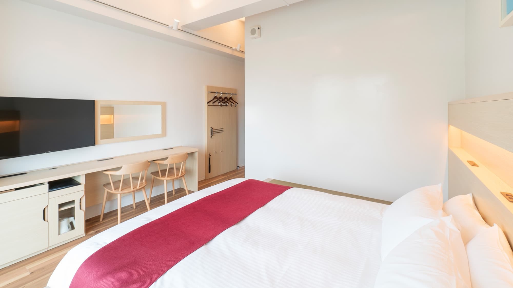 ■幅160センチの広々クイーンサイズベットが1台(定員1〜2名) ■240センチ幅のライティングデスク ■全客室、洗濯乾燥機付き