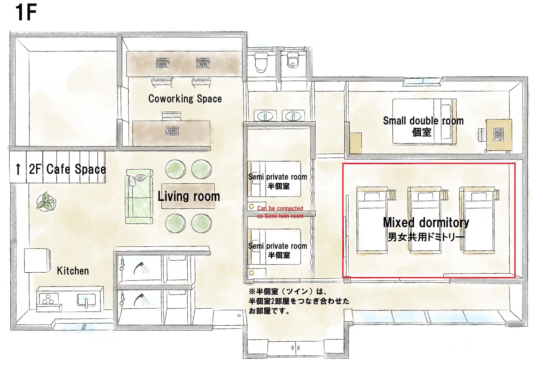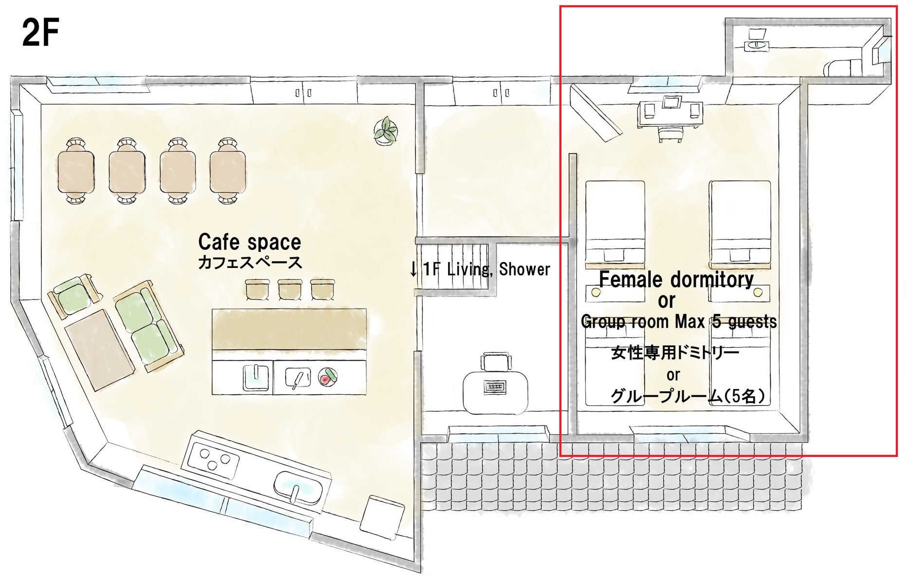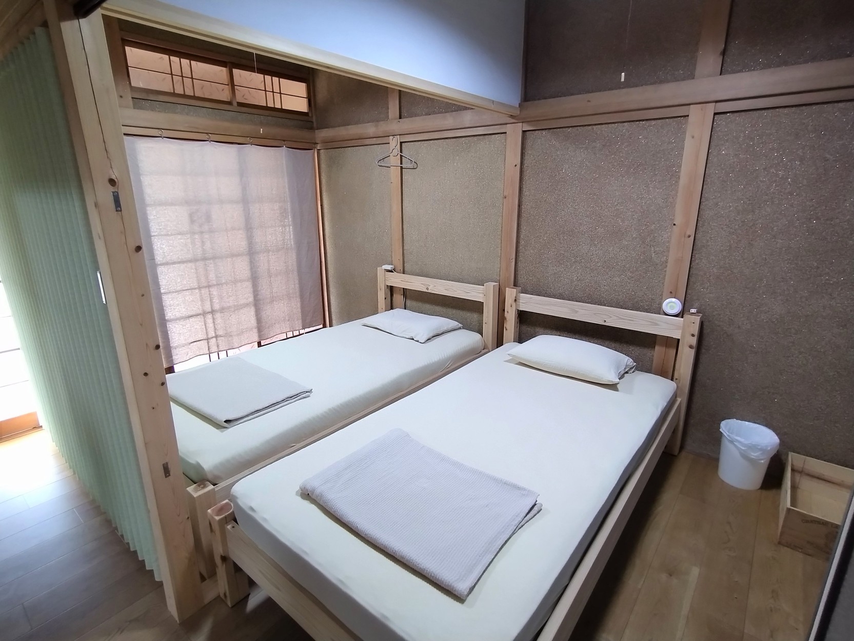 アコーディオンカーテンで仕切られているお部屋となります。男女共用ドミトリーに隣接しており、 トイレ、シャワーは共同となります。
