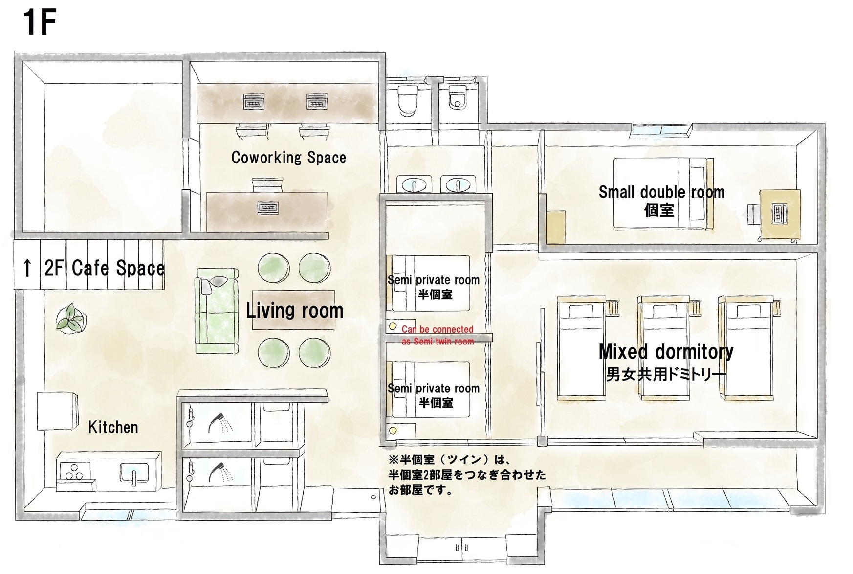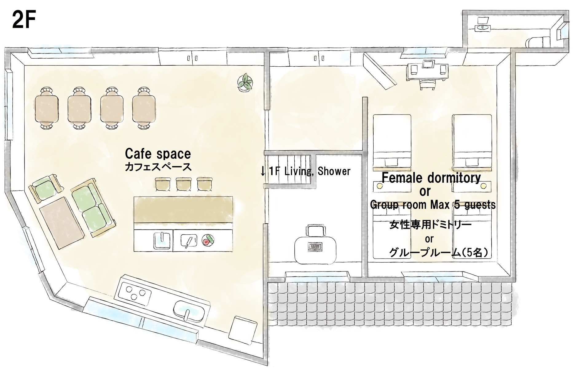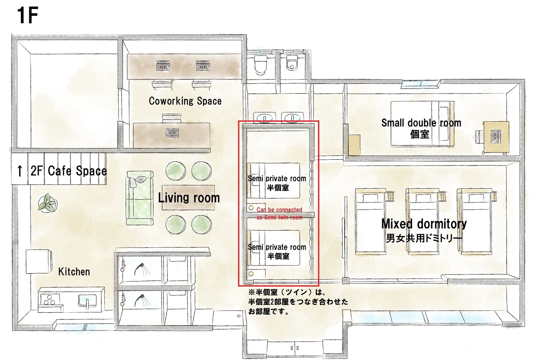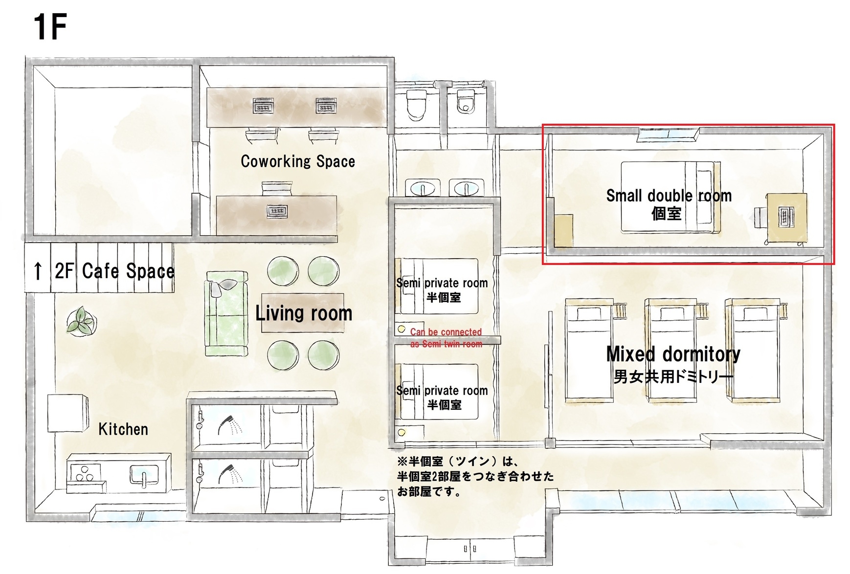 アコーディオンカーテンで仕切られているお部屋となります。男女共用ドミトリーに隣接しており、 トイレ、シャワーは共同となります。