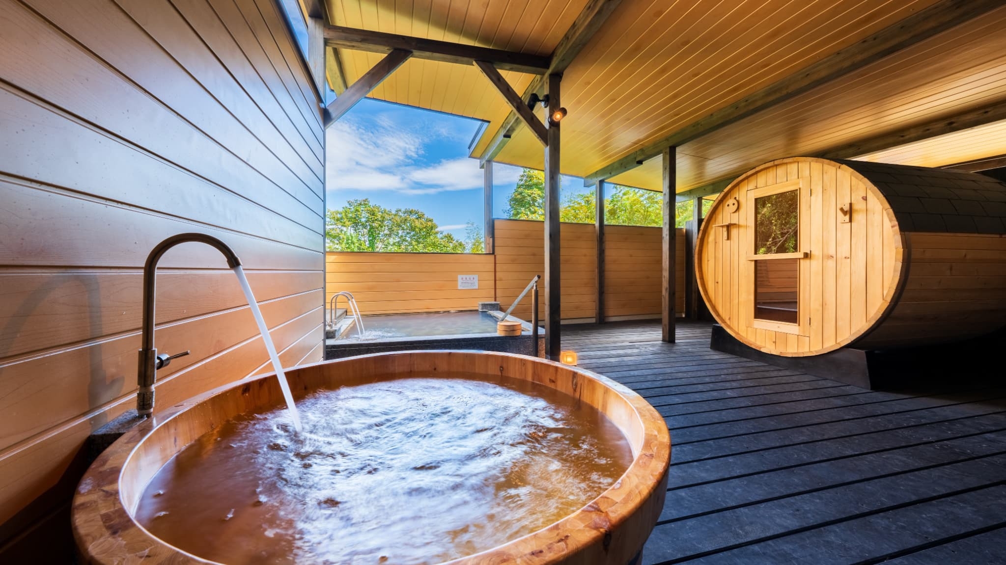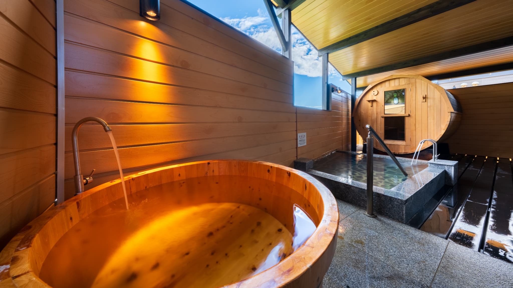 客室面積50平米、セミダブルベッド3台、露天風呂・内風呂、低温バレルサウナ・水風呂付※入口に階段あり