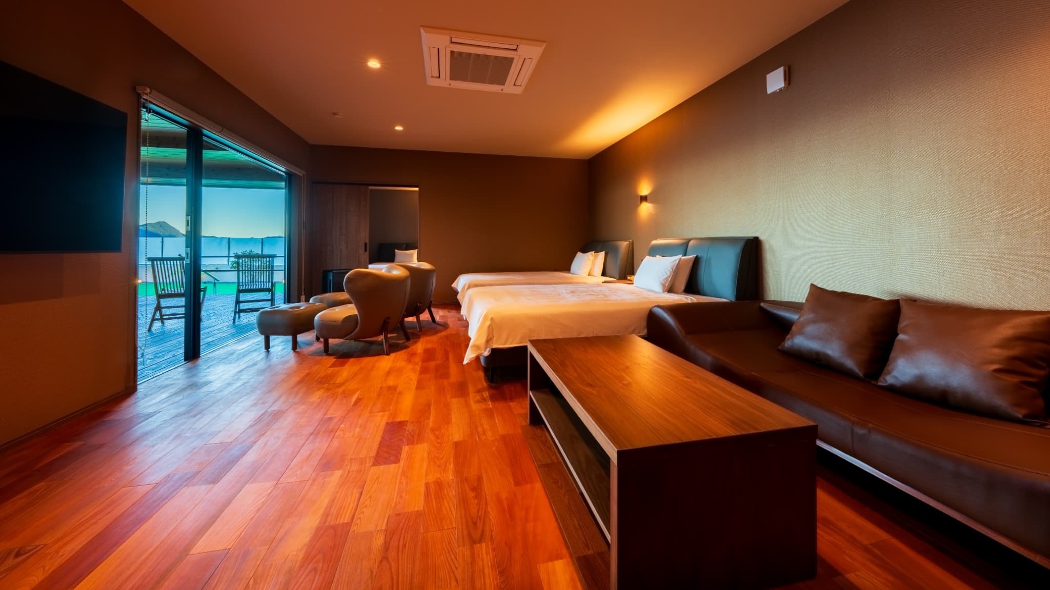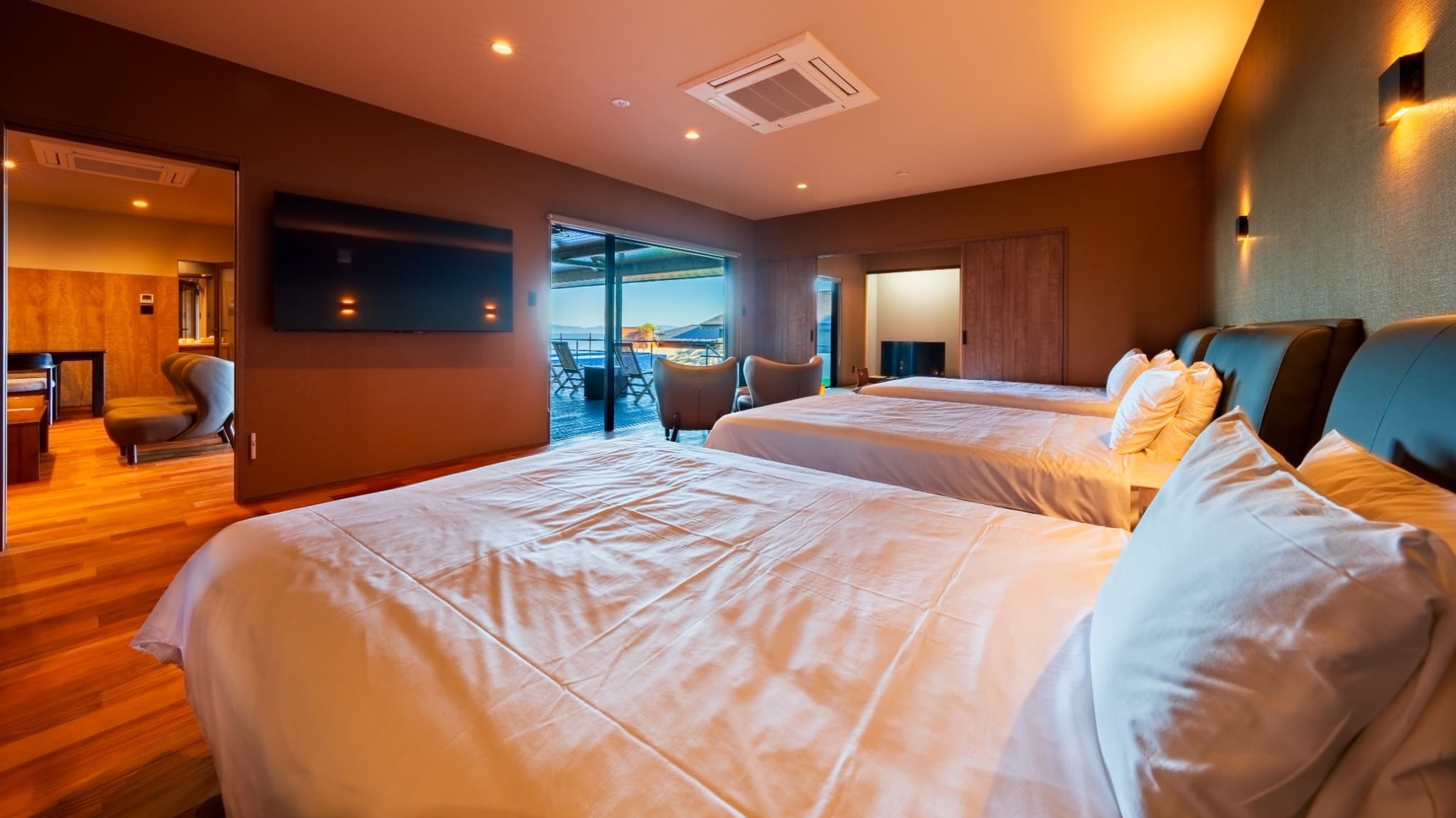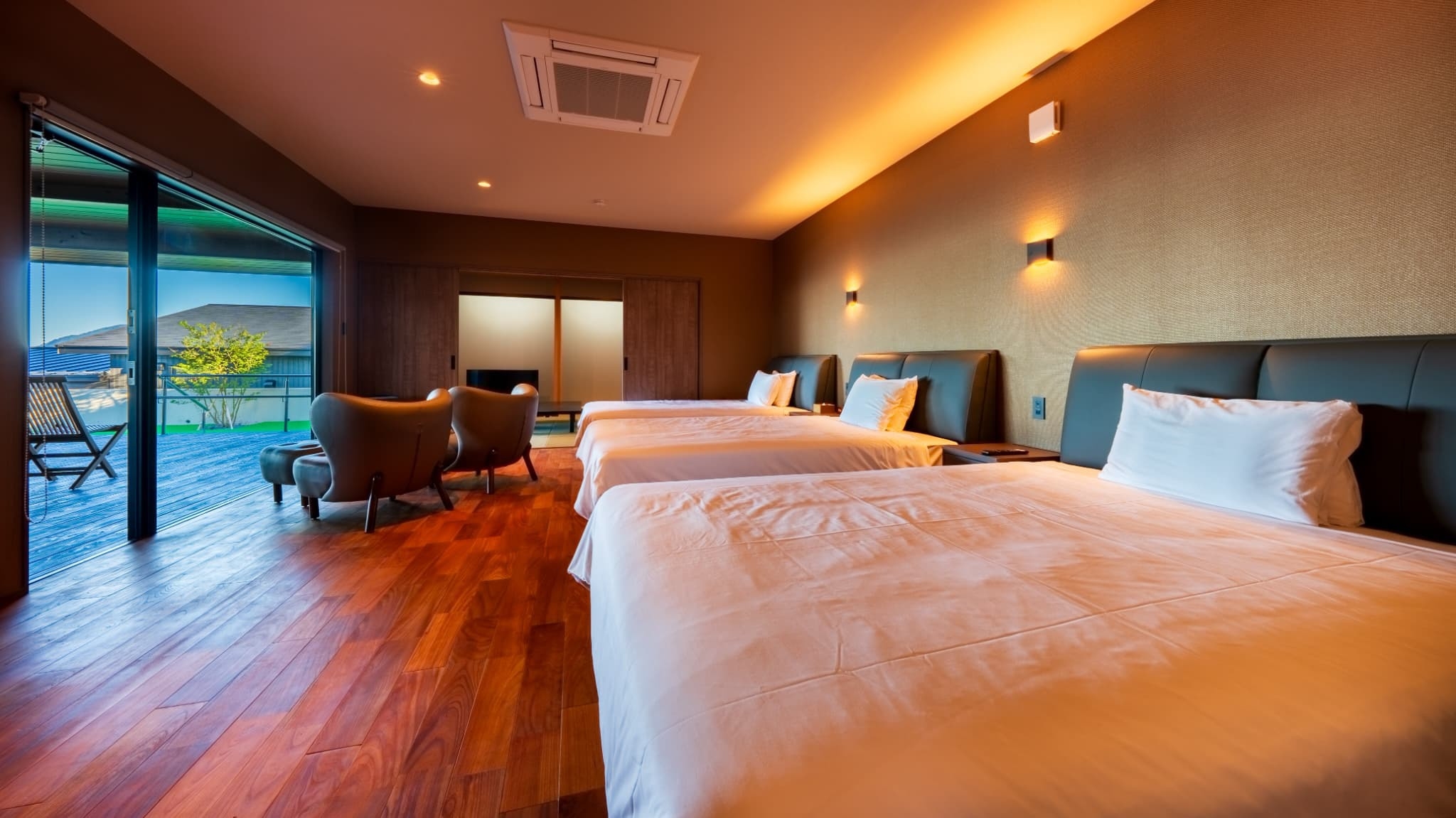 客室広さ100平米、ダブルベッド3台(4名以上は布団)、露天風呂・内風呂、バレルサウナ・水風呂、7〜9月限定プール付※入口に段差あり