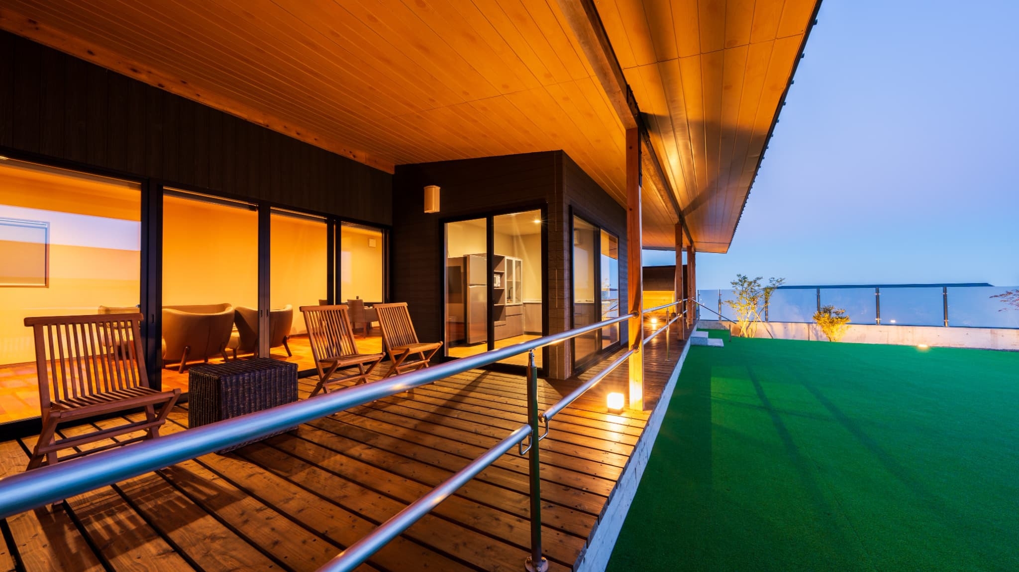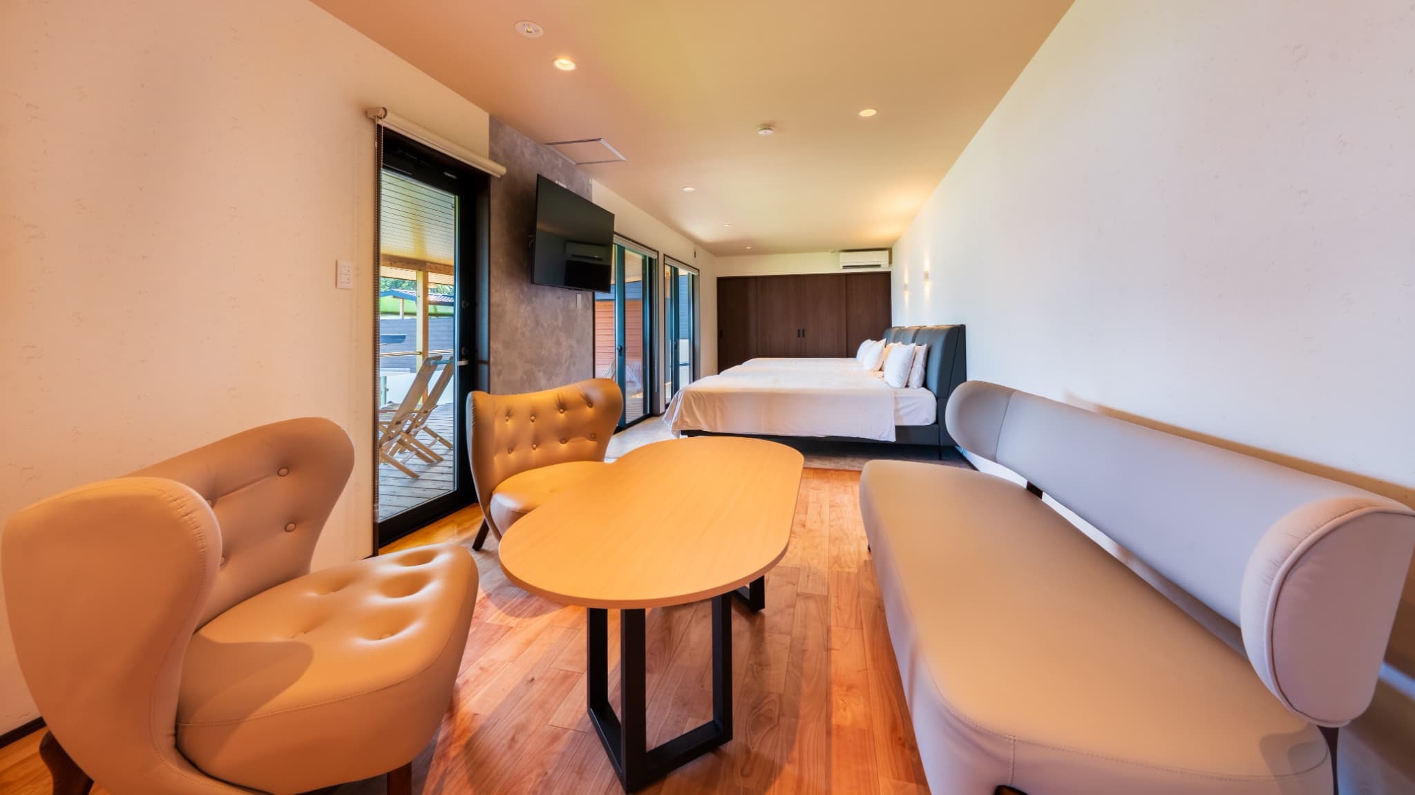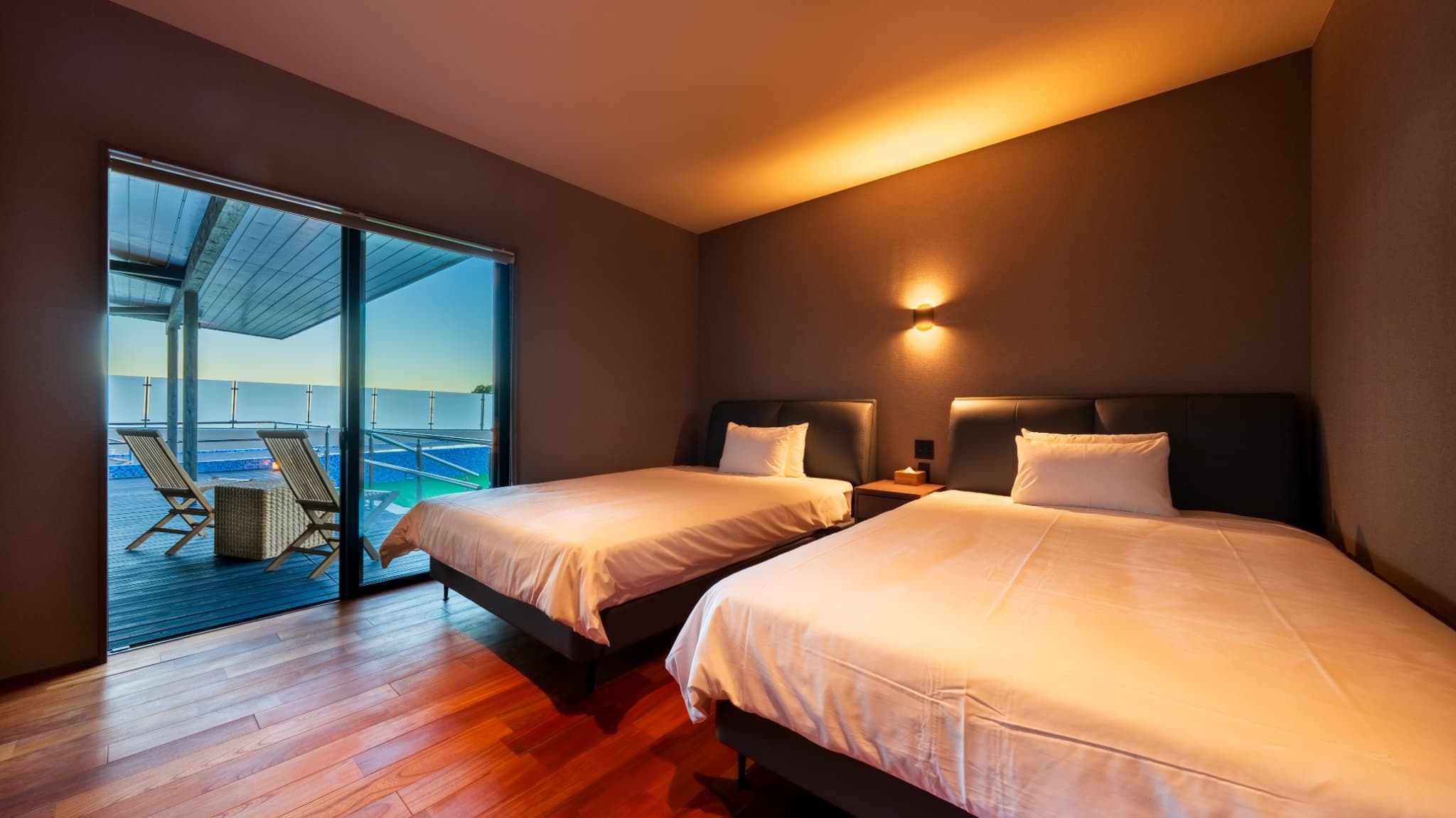 客室広さ100平米、ダブルベッド3台(4名以上は布団)、露天風呂・内風呂、バレルサウナ・水風呂、7〜9月限定プール付※入口に段差あり