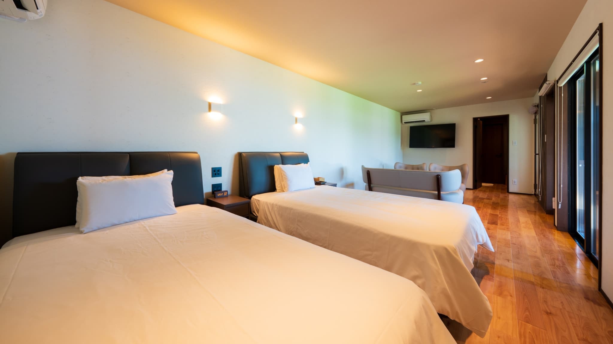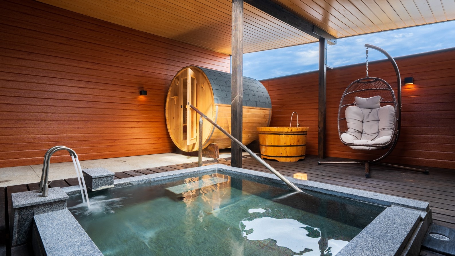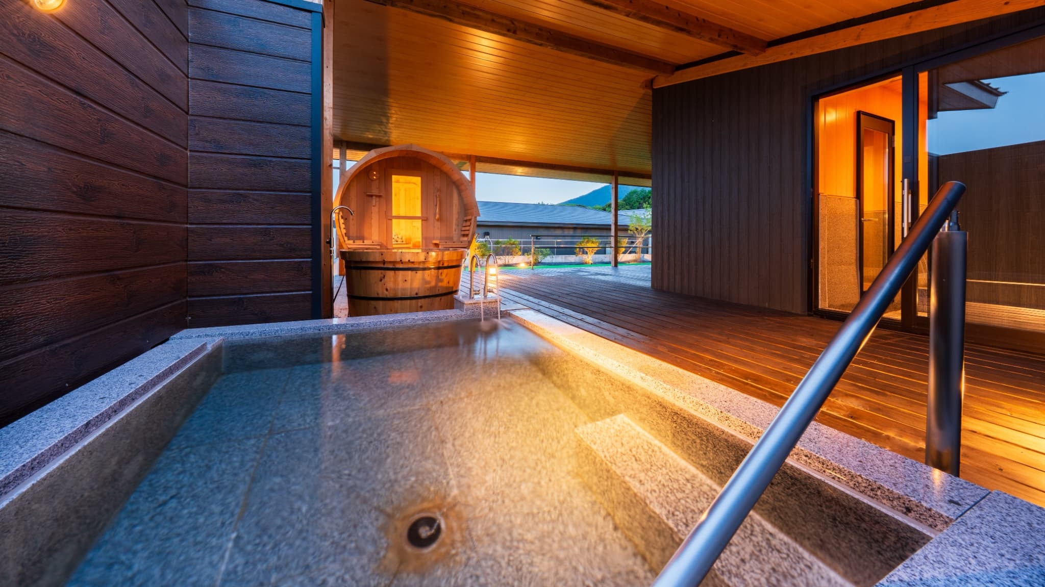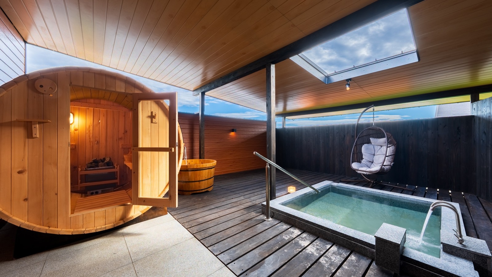 客室面積50平米、セミダブルベッド2台、露天風呂・内風呂、バレルサウナ・水風呂付※入口に階段あり