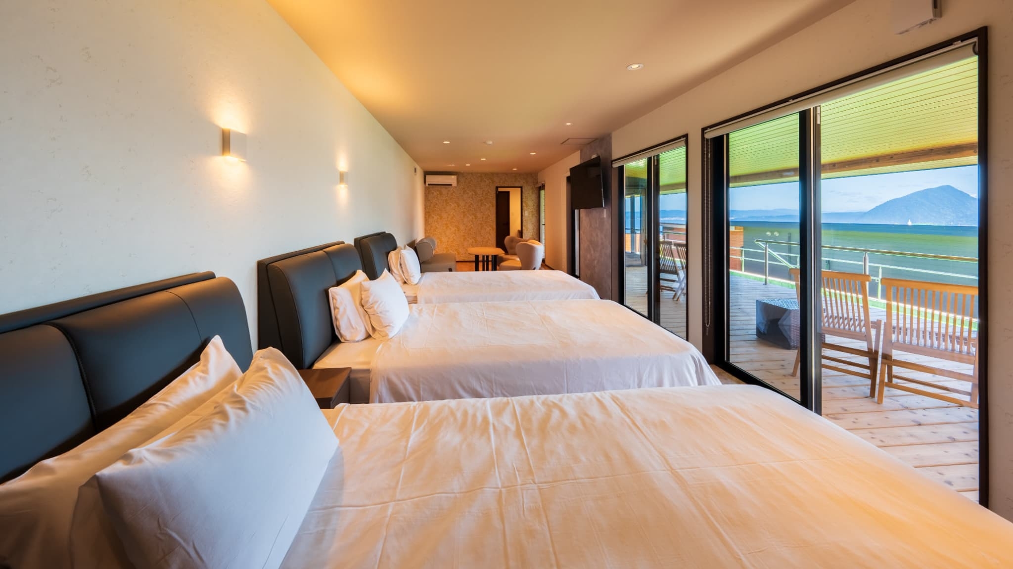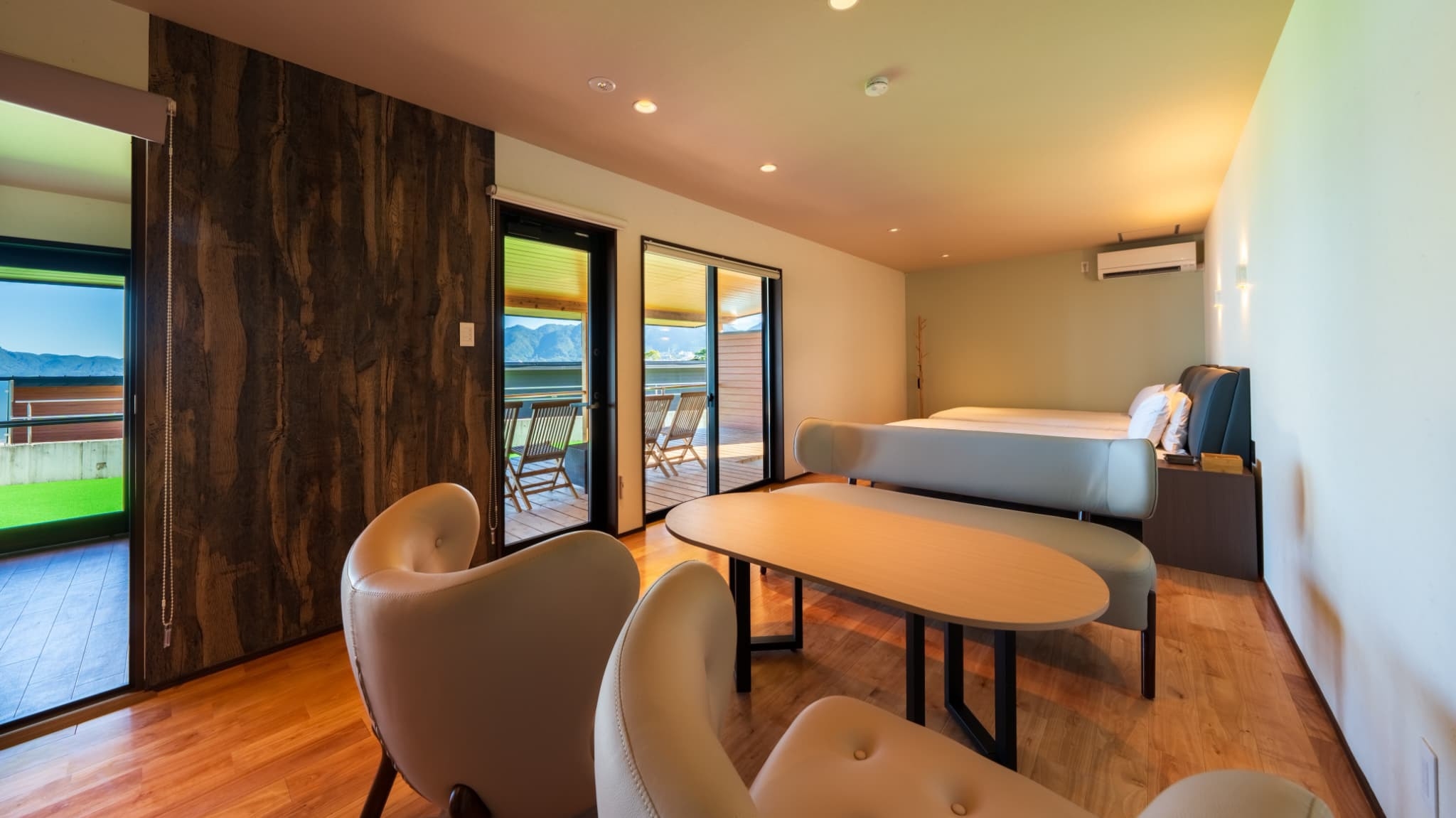 客室面積50平米、セミダブルベッド3台、露天風呂・内風呂、バレルサウナ・水風呂付※入口に階段あり