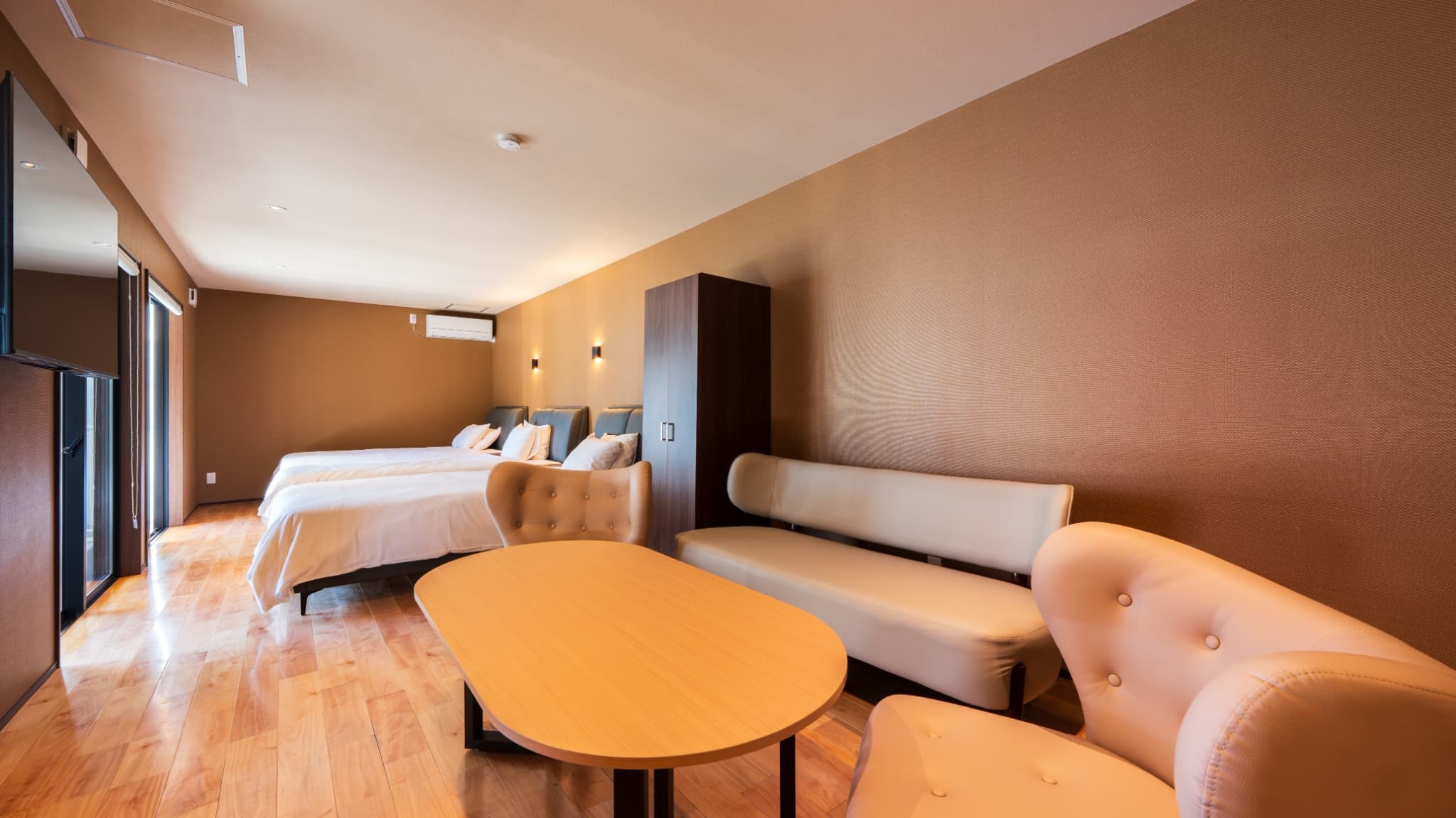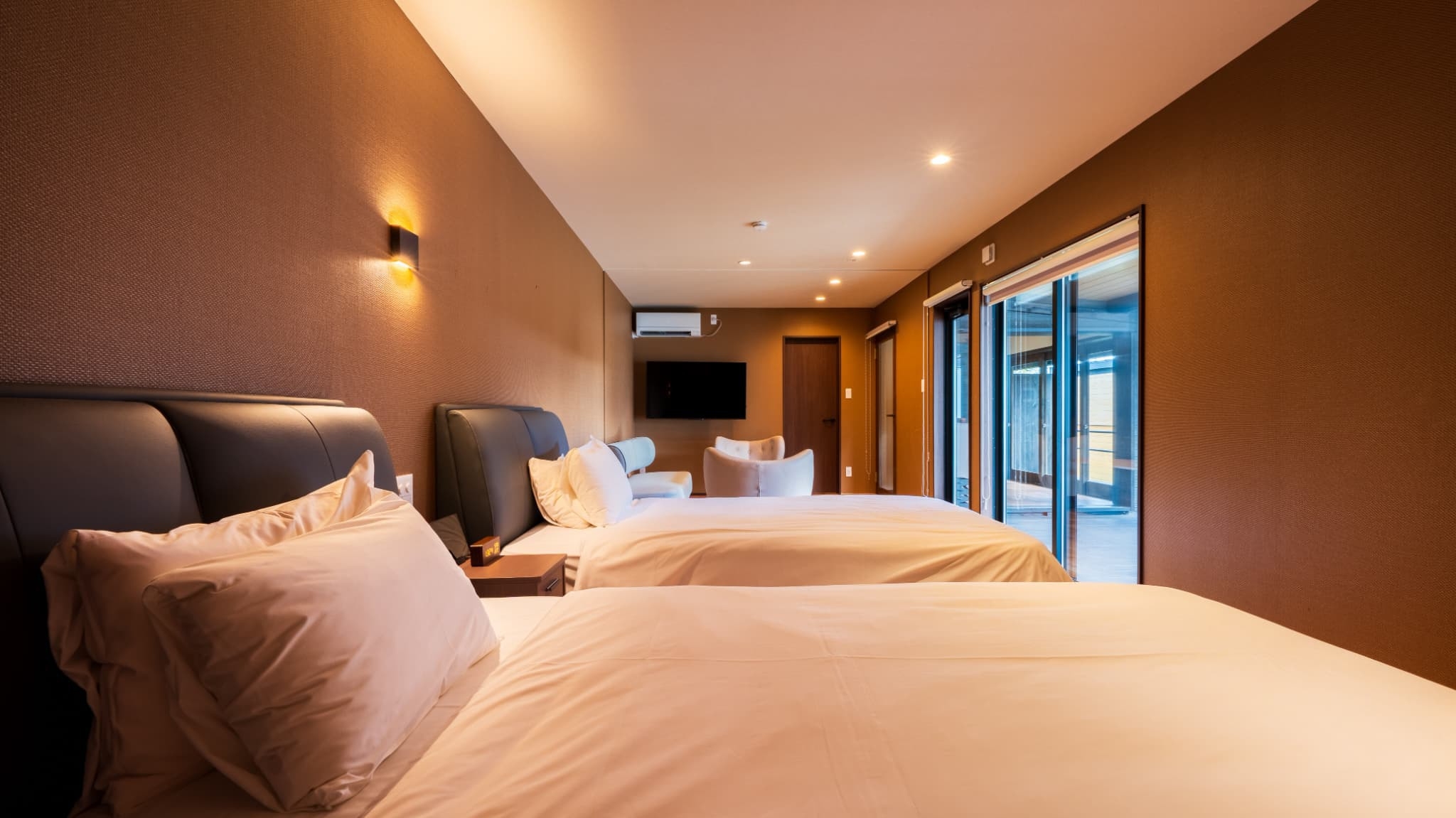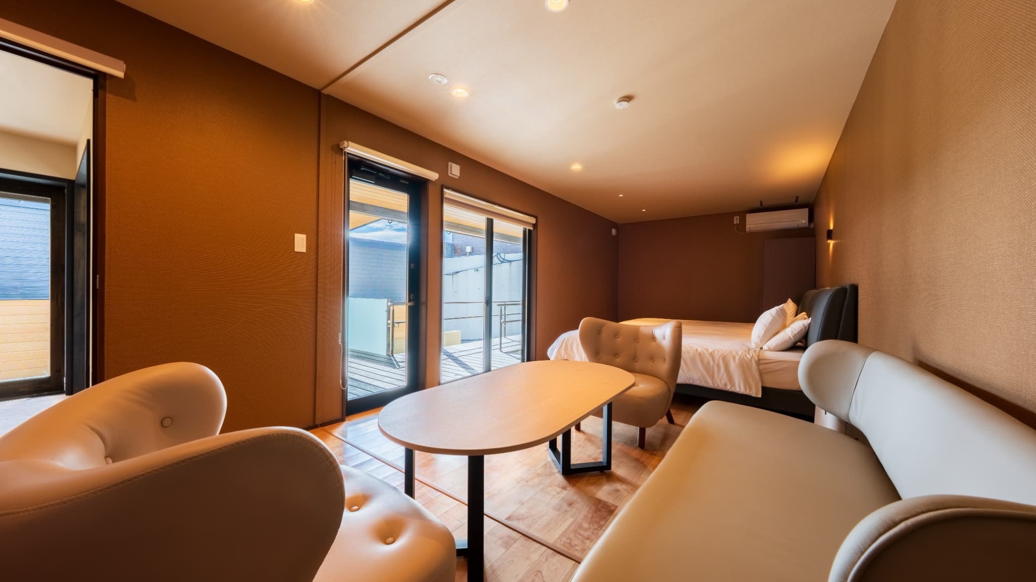 客室面積42平米、セミダブルベッド2台、露天風呂・内風呂、低温バレルサウナ・水風呂付※入口に階段あり
