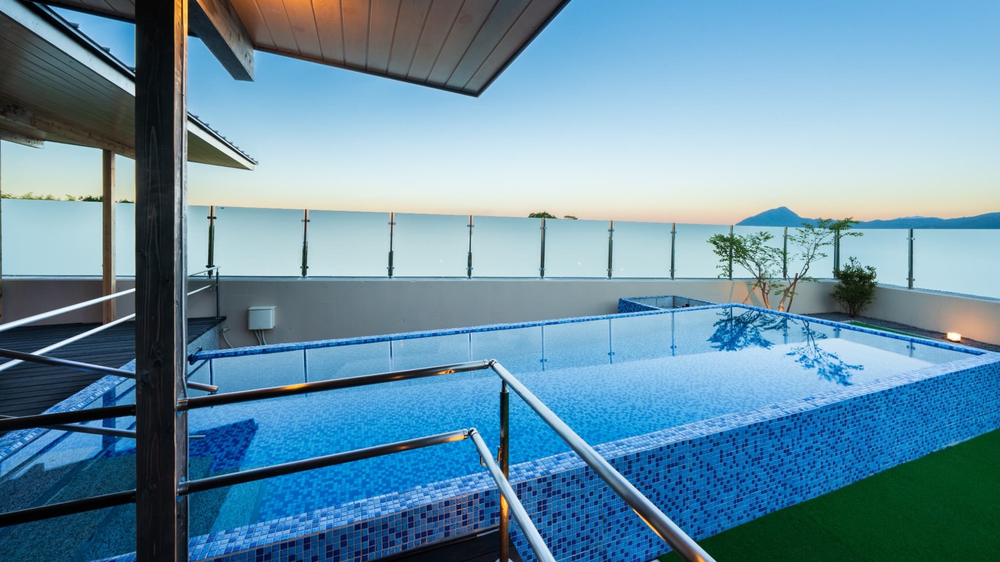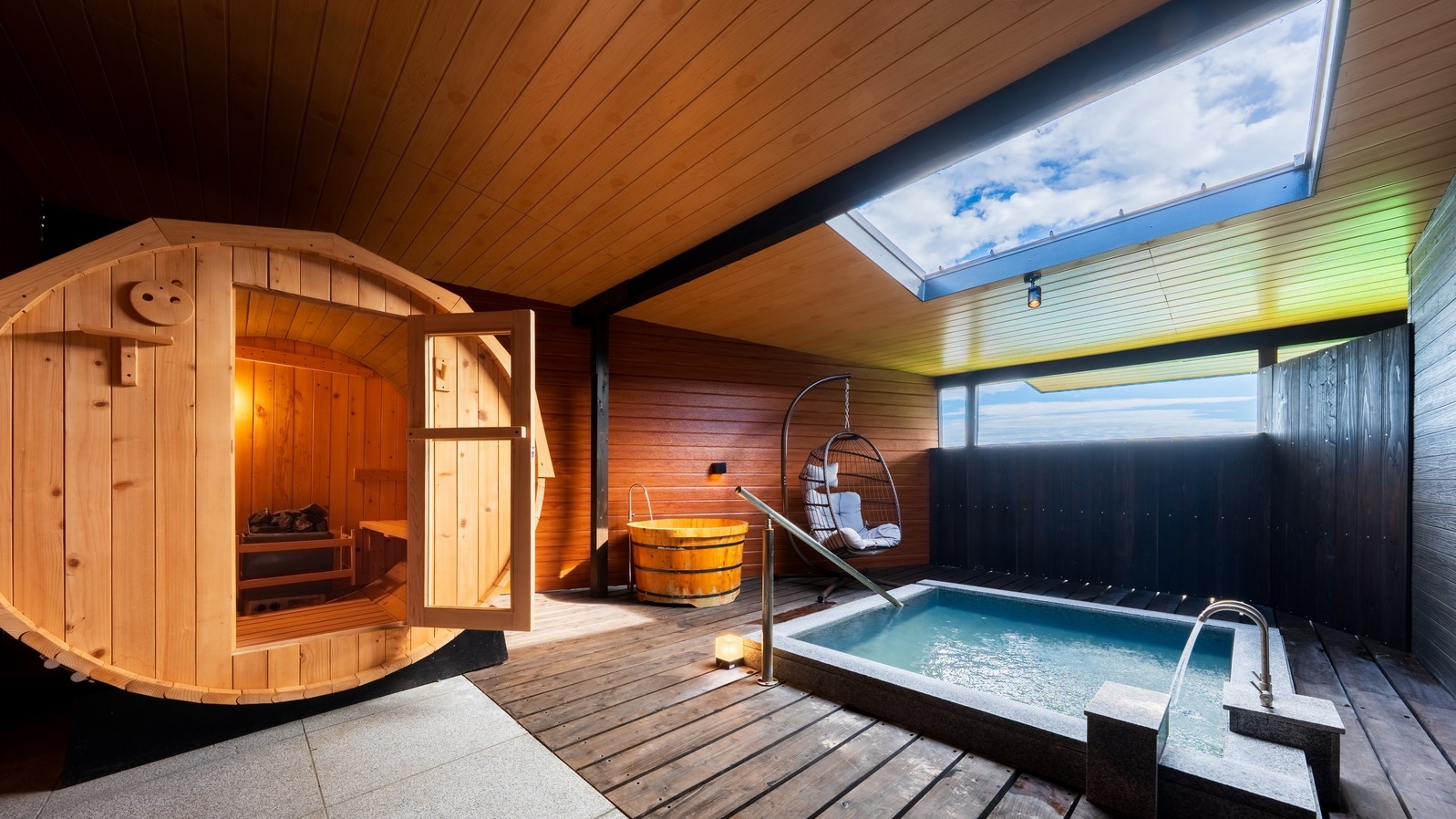 客室広さ100平米、ダブルベッド4台(2ベッドルーム)、露天風呂・内風呂、バレルサウナ・水風呂、7〜9月限定プール付※入口に段差あり