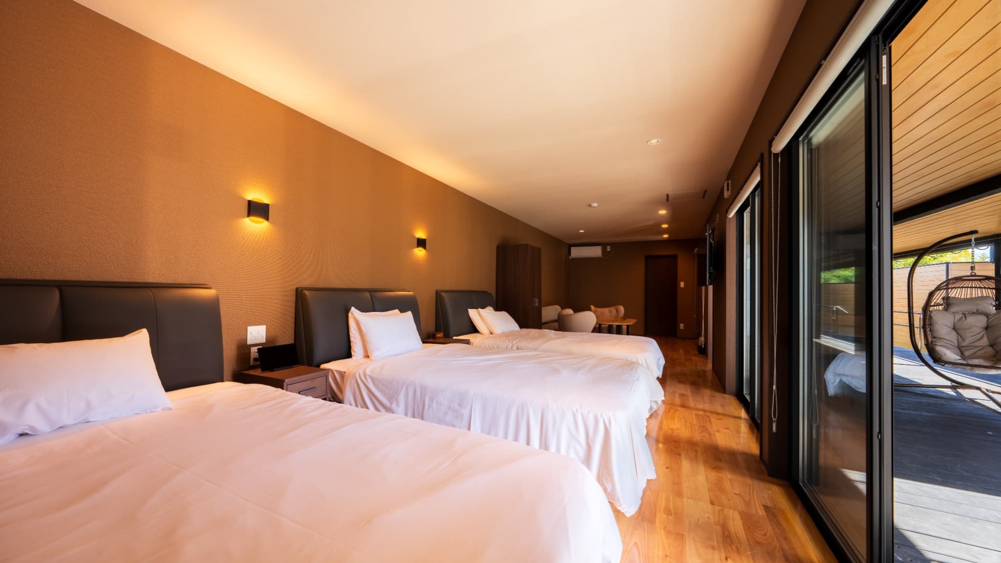 客室広さ100平米、ダブルベッド3台(4名以上は布団)、露天風呂・内風呂、低温バレルサウナ・水風呂、6〜9月限定プール付※入口に段差あり