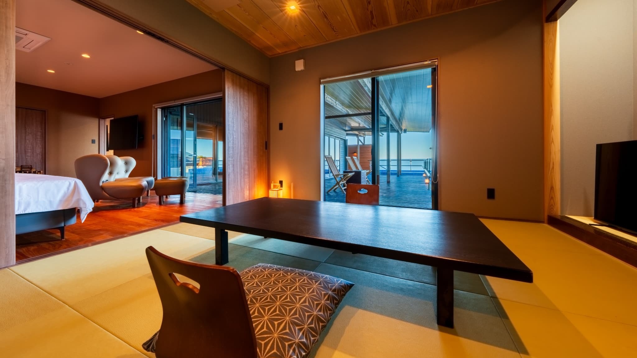 客室広さ100平米、ダブルベッド3台(4名以上は布団)、露天風呂・内風呂、バレルサウナ・水風呂付※入口に段差あり