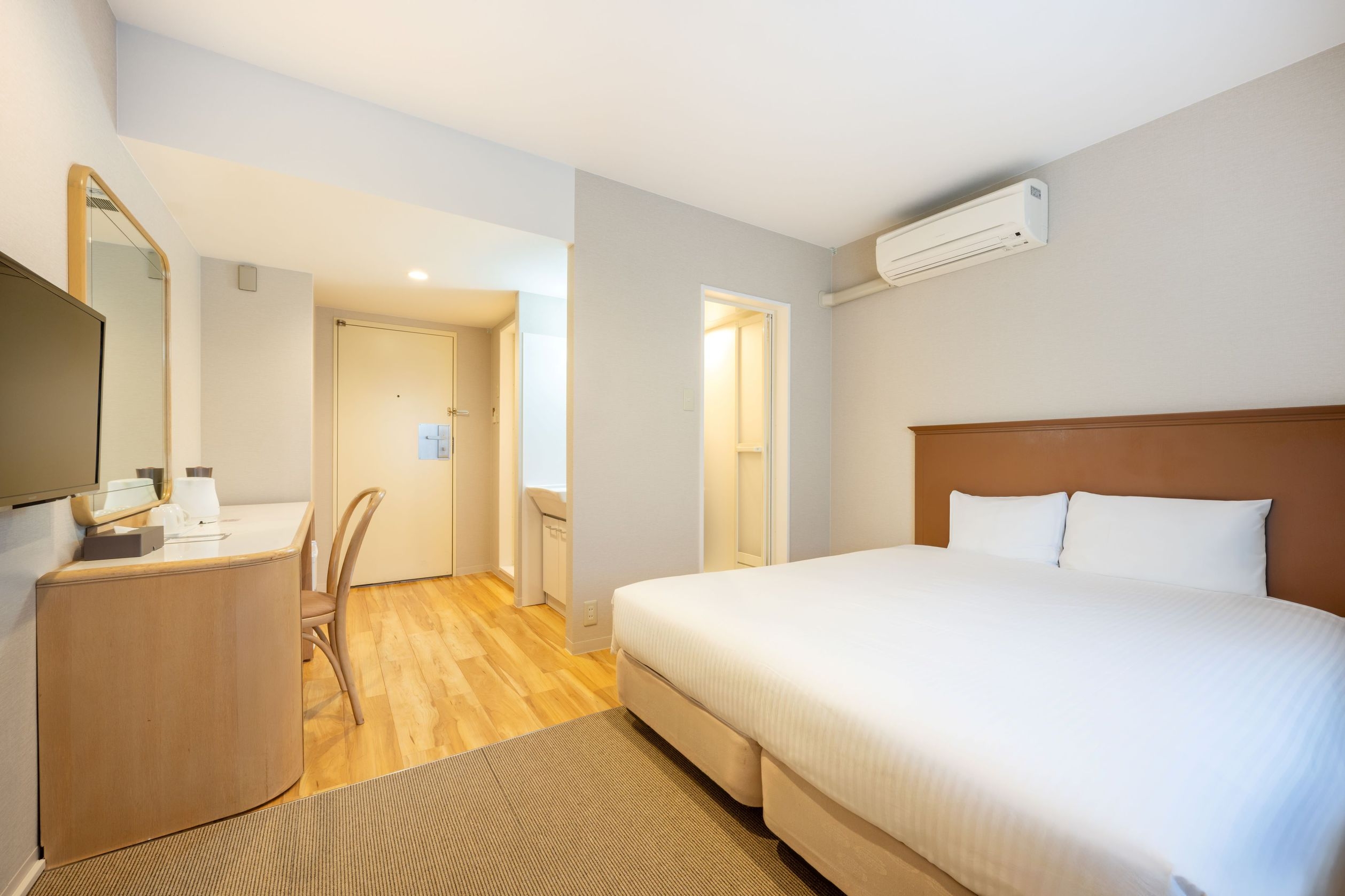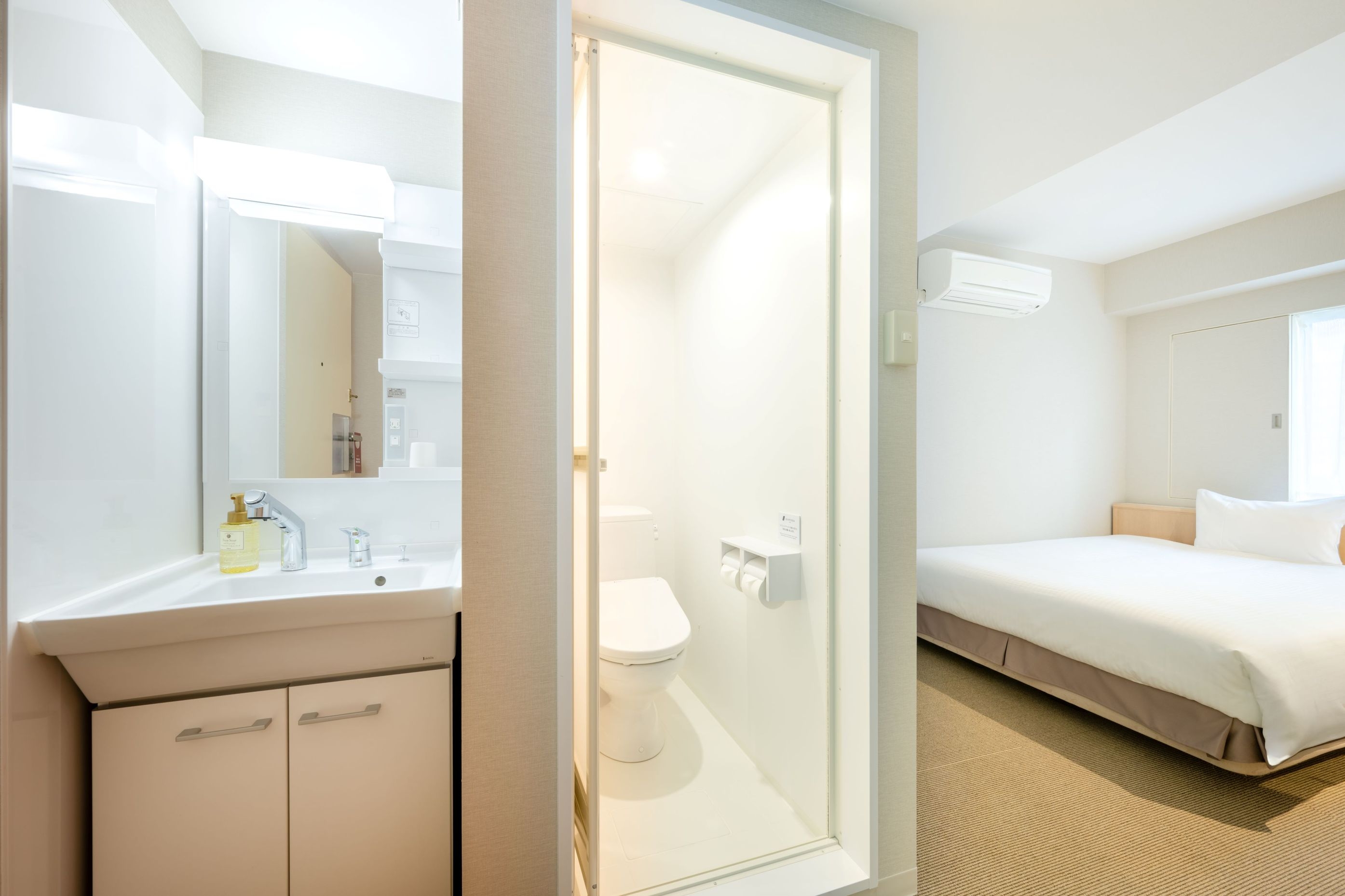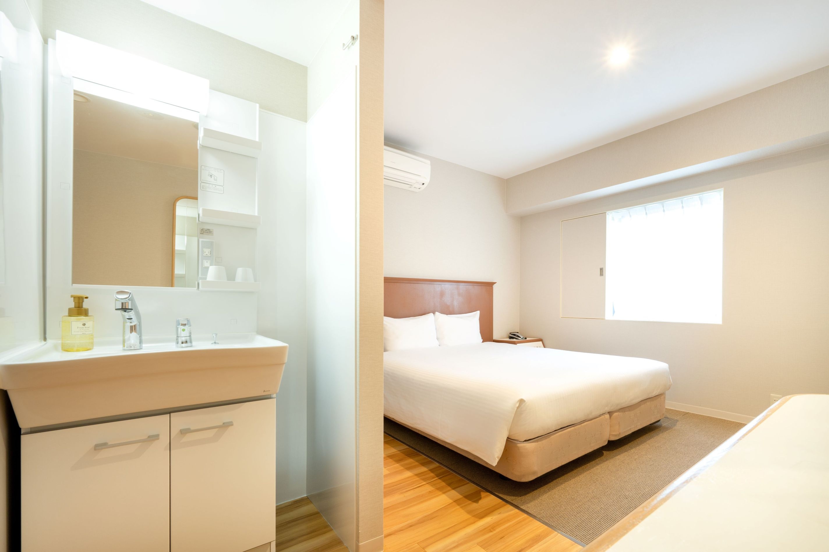 ゆったり160cm幅のクイーンサイズベッドを備え、洗面台独立で、浴槽はなくシャワーのみのお部屋です。