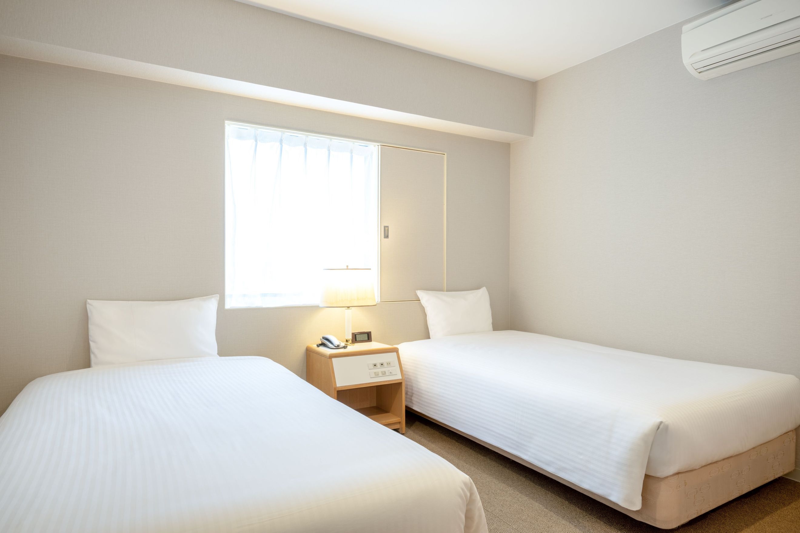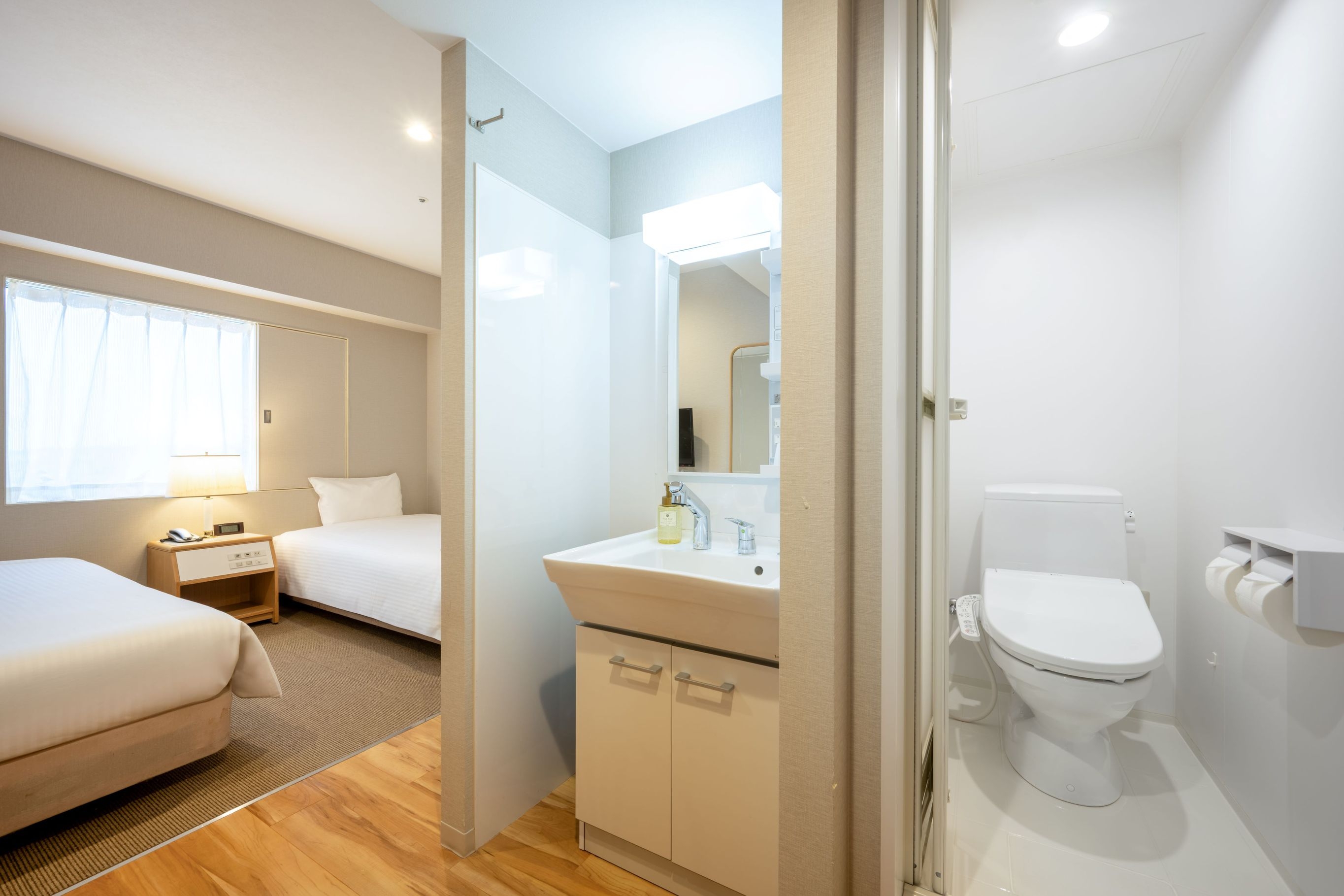 110cm幅のシングルベッド2台、洗面台独立で、浴槽はなくシャワーのみのお部屋です。