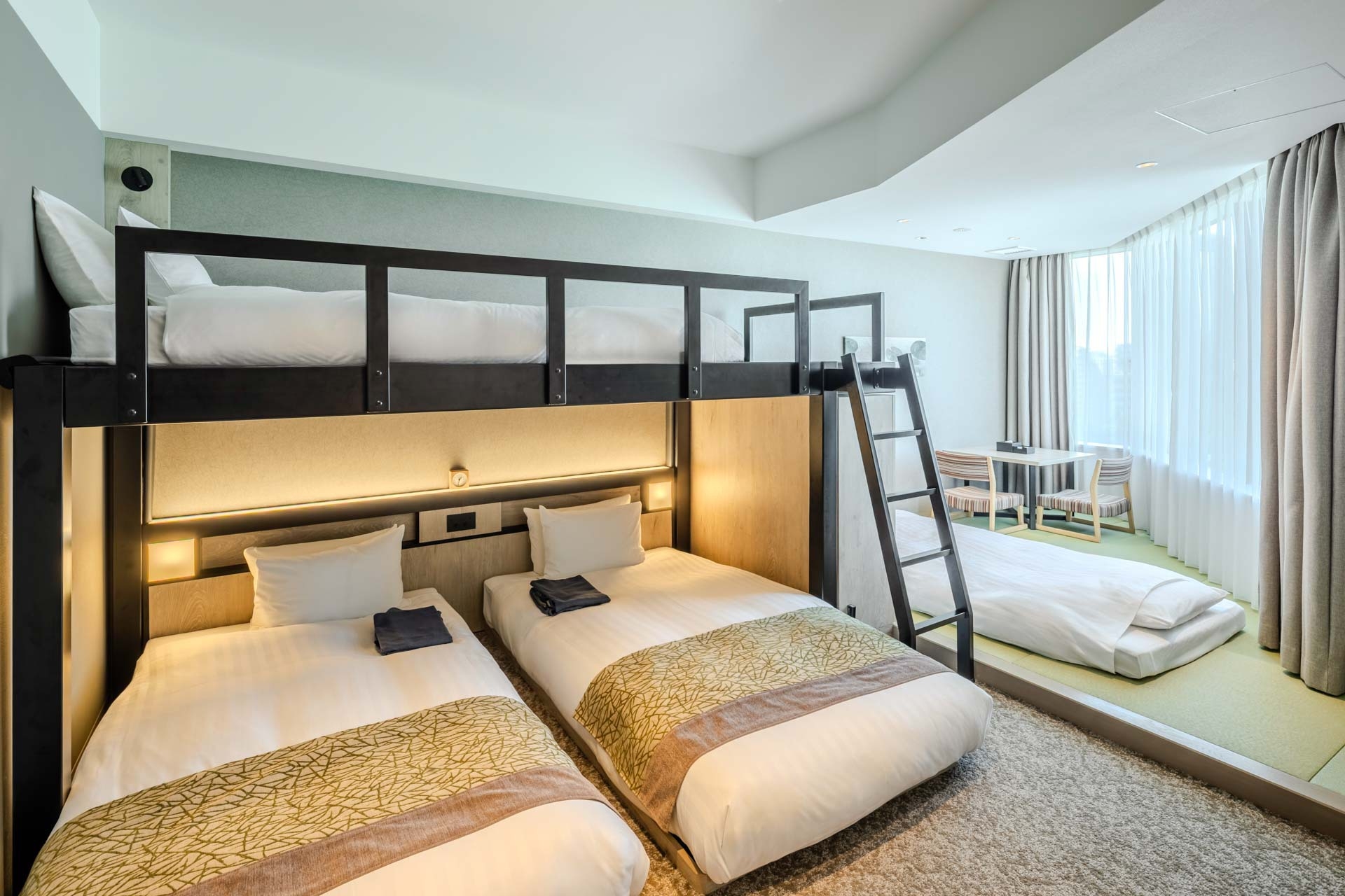 ◆ベッド110cm幅×2台+100cm幅×1台、布団100cm幅×1組 ◆未就学(乳幼児)の添い寝のお子さまは、1部屋につき2名まで無料でご宿泊いただけます