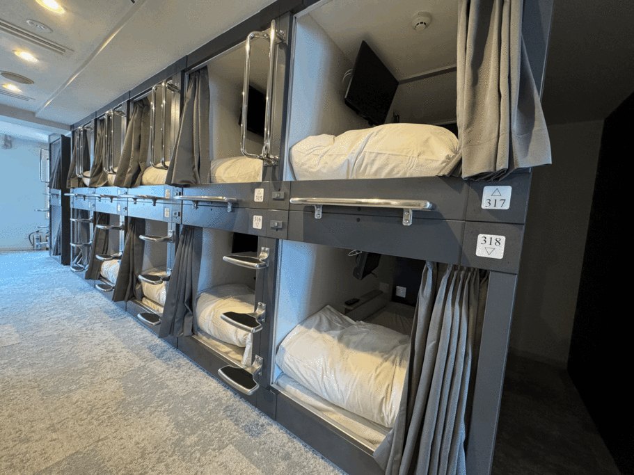 2025年8月に完成した新しいカプセル。個別に「TV」「空調」「USB」完備。広めのカプセルに寝心地のいい寝具。