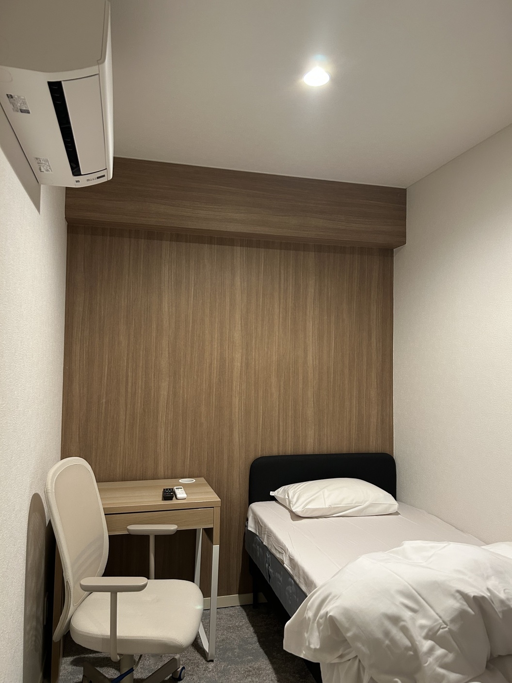 2025年8月に完成した新しいカプセル。個別に「32型TV」「エアコン」「シングルベッド」「デスク」「コンセント」完備。寝心地のいい寝具を使用しています。