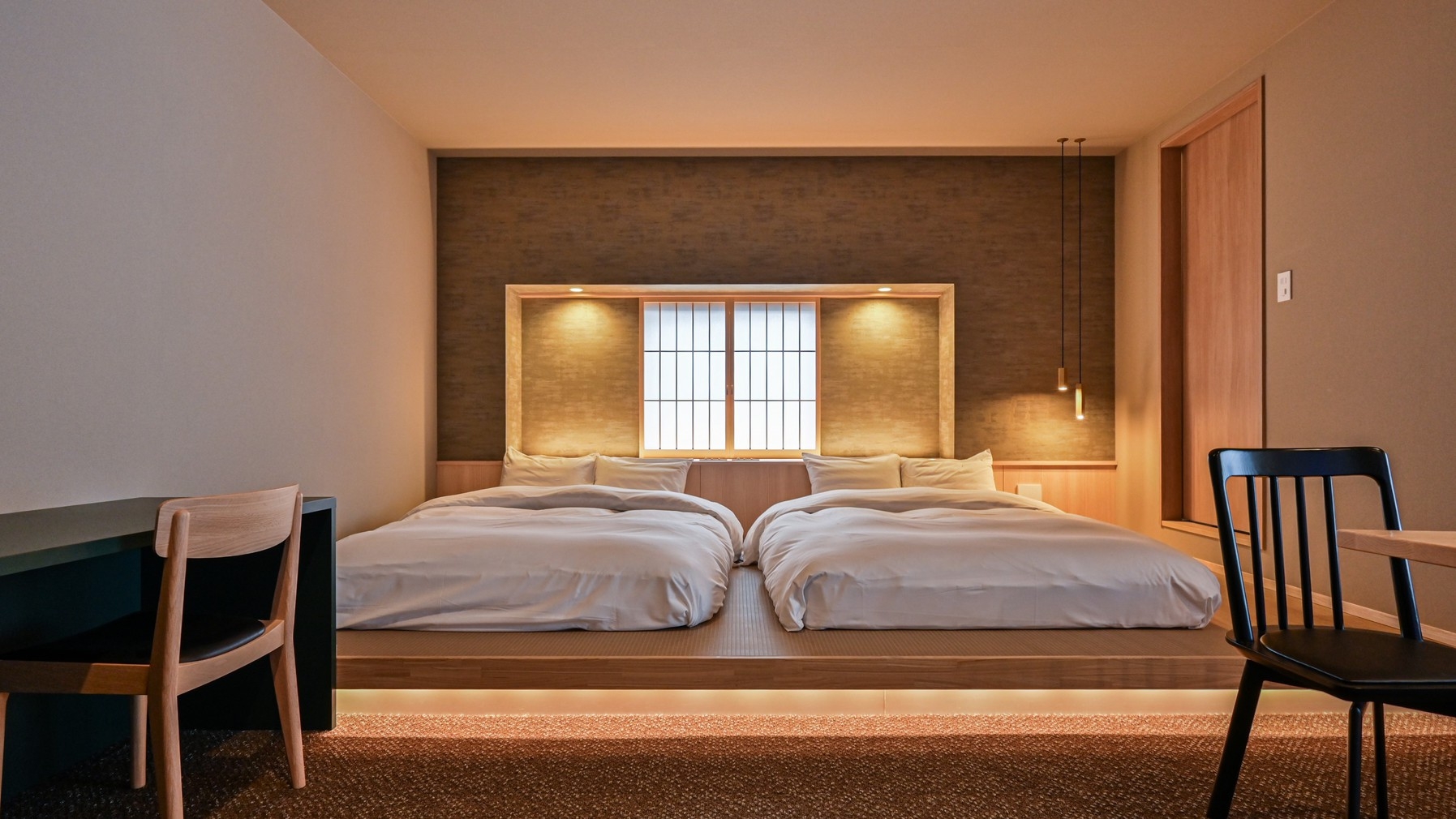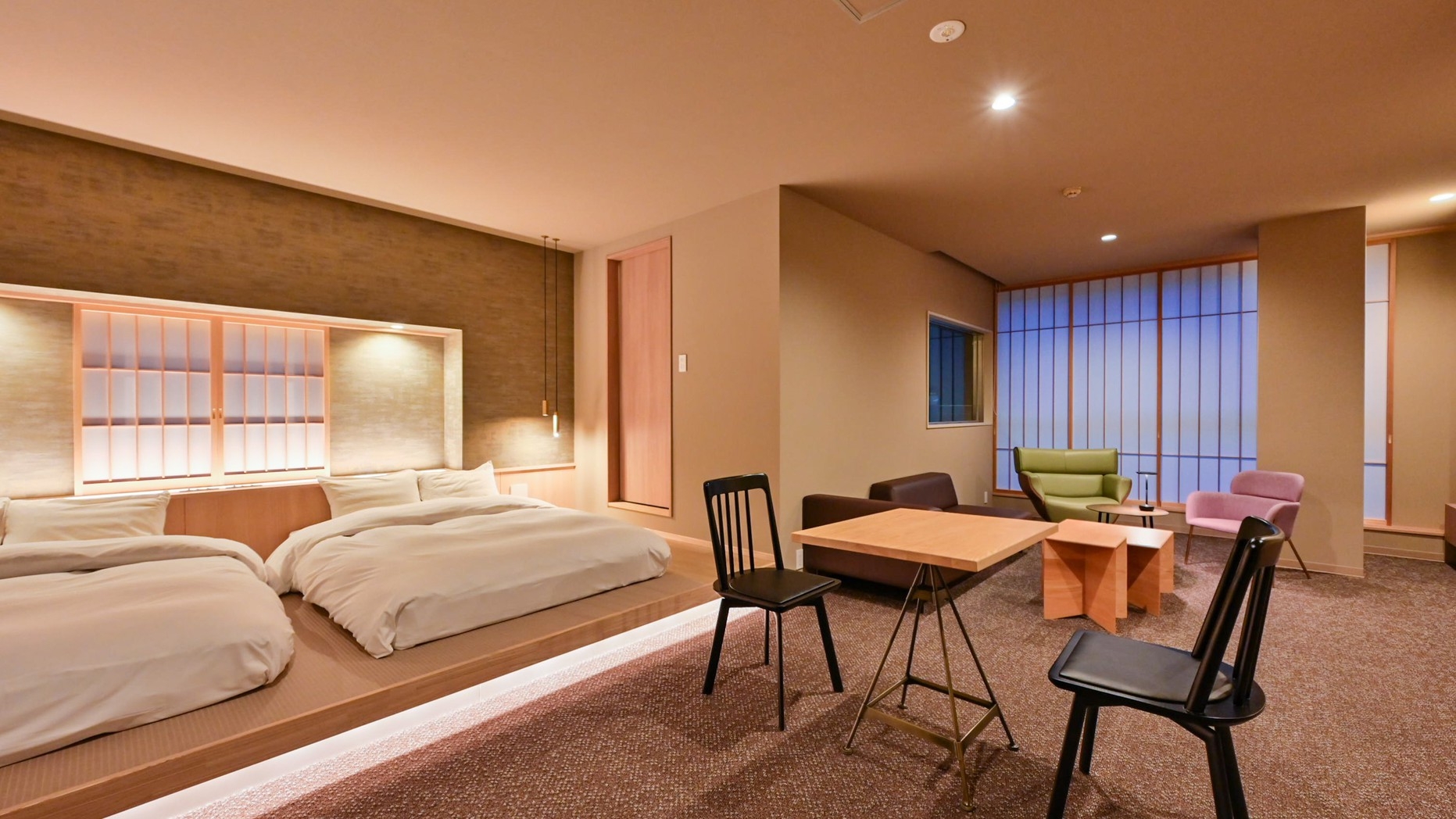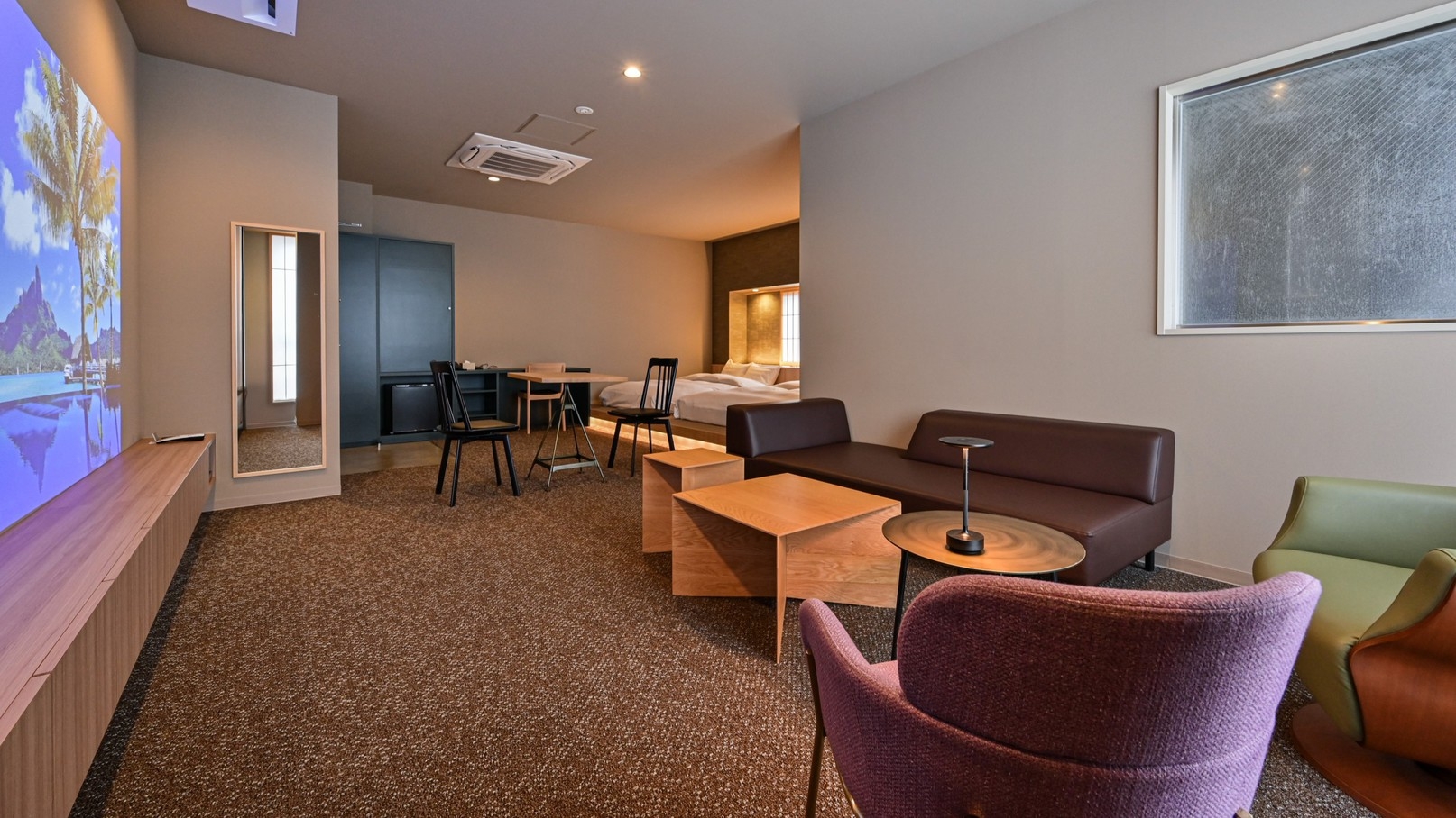 室内に温泉かけ流しの露天風呂、デスク、ソファ付き/ダブルベッド2台/50型TV/電子煙草も含み完全禁煙/チェックイン時の冷蔵庫OFFをSDGsにご協力下さい