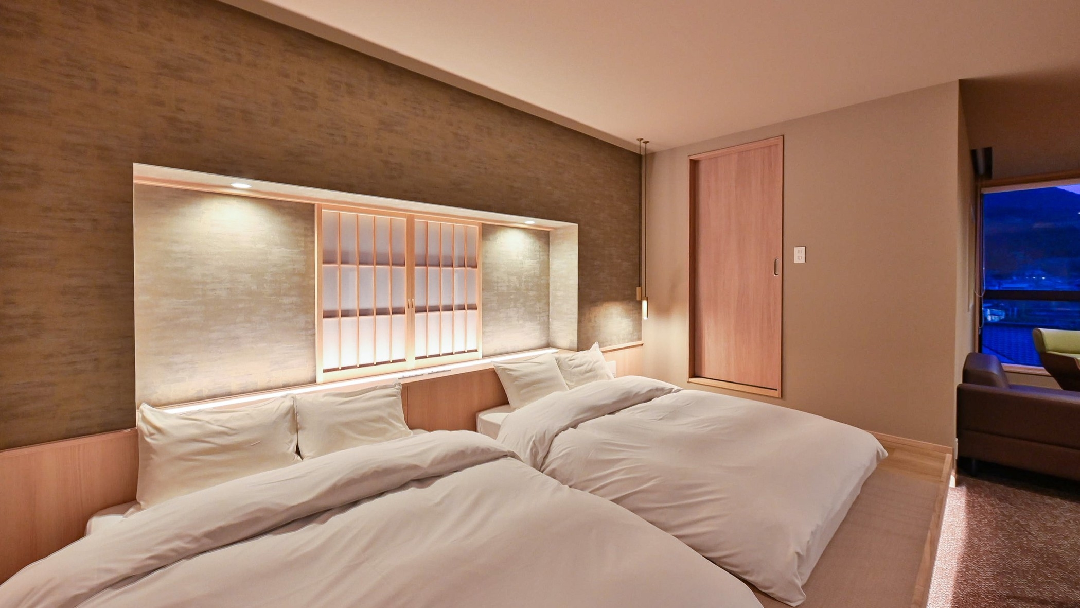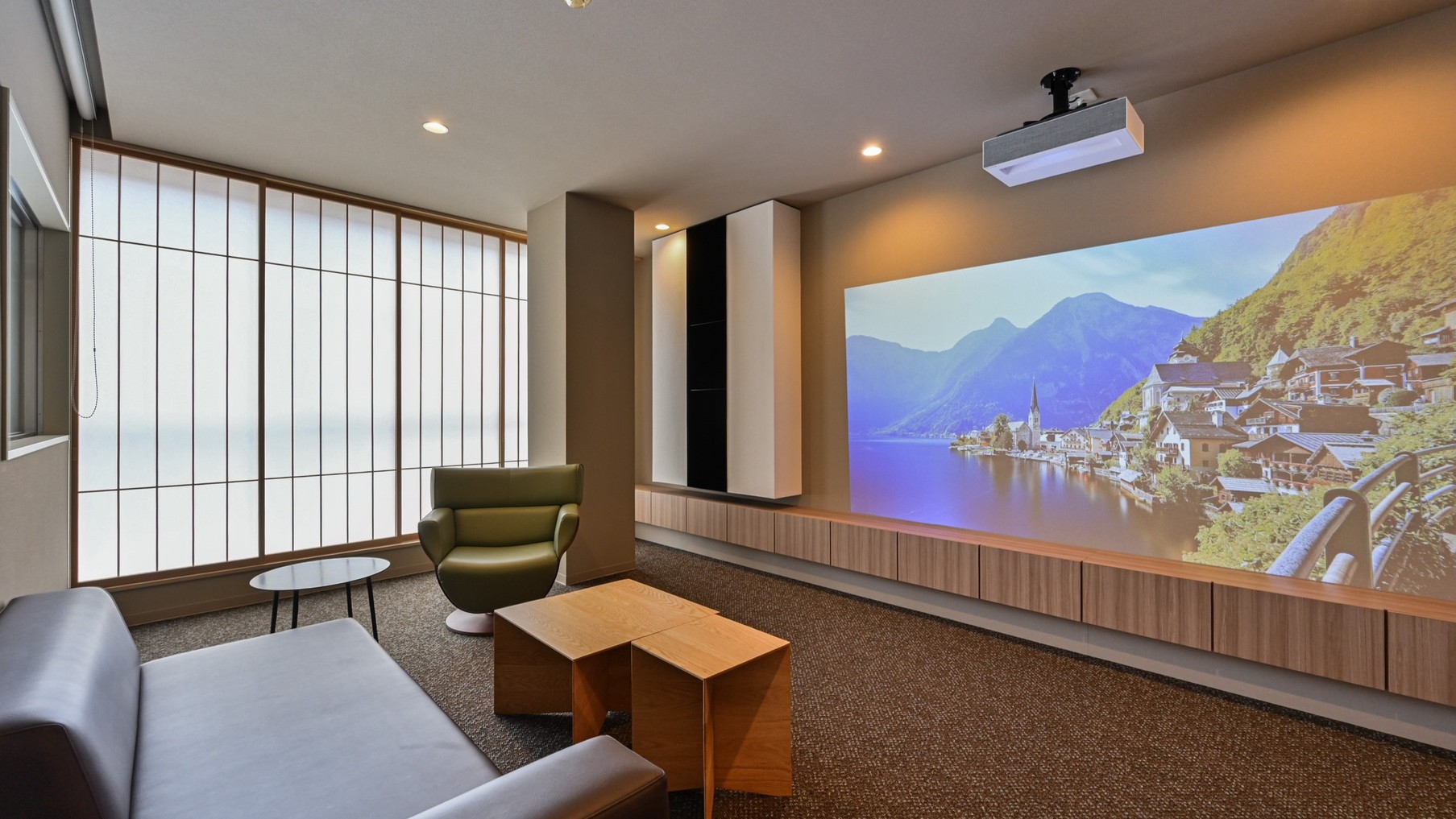 室内に温泉かけ流しの露天風呂、ソファ、デスク、ベッド2台/電子煙草も含み完全禁煙/120型プロジェクター付/チェックイン時の冷蔵庫OFFをSDGsにご協力下さい