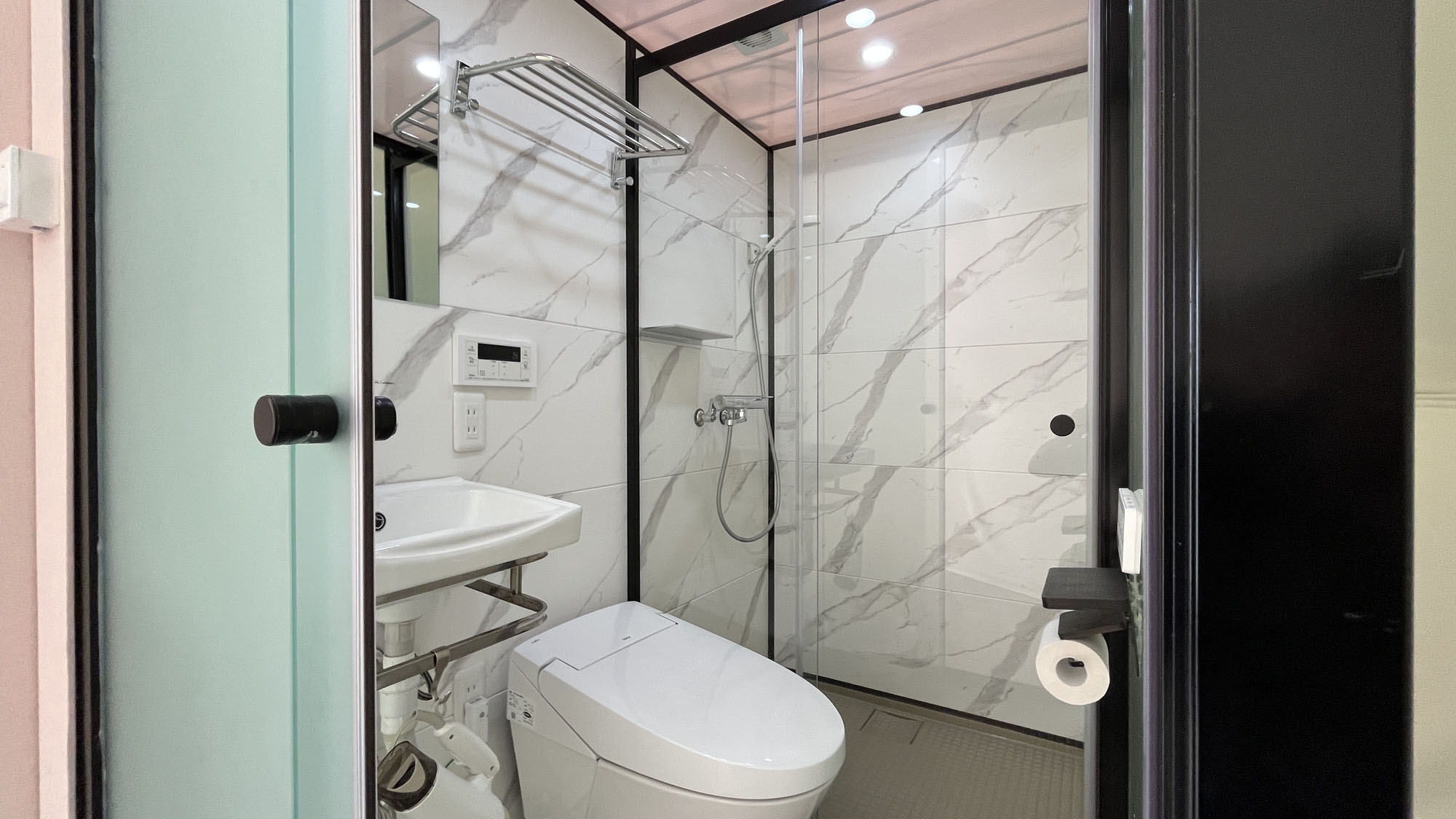 ダブルベット2台のお部屋です。 お風呂はシャワーのみとなります。 ソファーはベッドとしてもお使いいただけます。(別途料金) お部屋、テラスからは海を一望できます