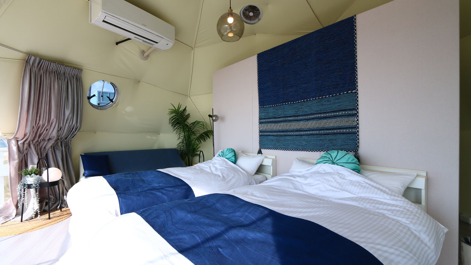 LION名物トレーラーハウス。 キングサイズのベット2台のお部屋です。 お風呂はシャワーのみとなります。 お部屋からは夕日もバッチリ、独り占め。