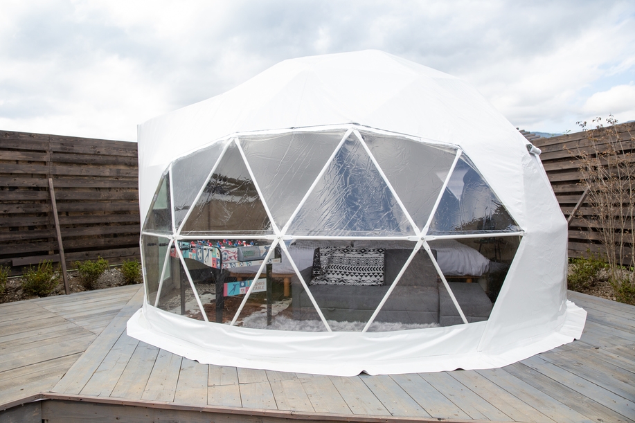 【快適ステイ】エアコン、ダブルベッド×2、ソファーベッド、露天浴槽、シャワートイレ、焚き火台。一部のドームテントは遮光のため、窓から外の景色は見えません。