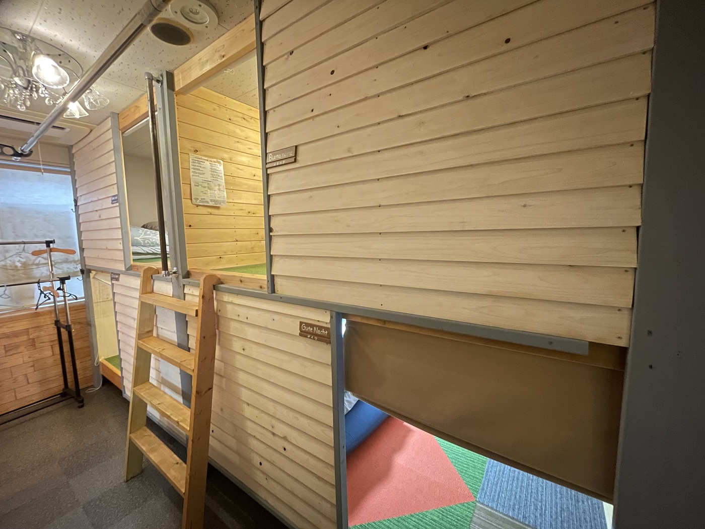 木のぬくもり溢れる、当館で一番お得なカプセルタイプのお部屋です。男女共用の相部屋で、水回りは共用です。お食事や会話はシャンデリアの共用スペースでお願いします