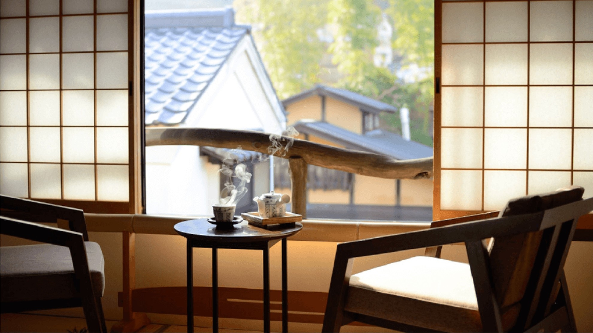 天井高の現し仕上げの居間、手水鉢のある坪庭に面した空間で憩いの時間をお過ごしください。内海を望む二階の温泉からは、朝夕で表情を変える湾景をお楽しみいただけます。