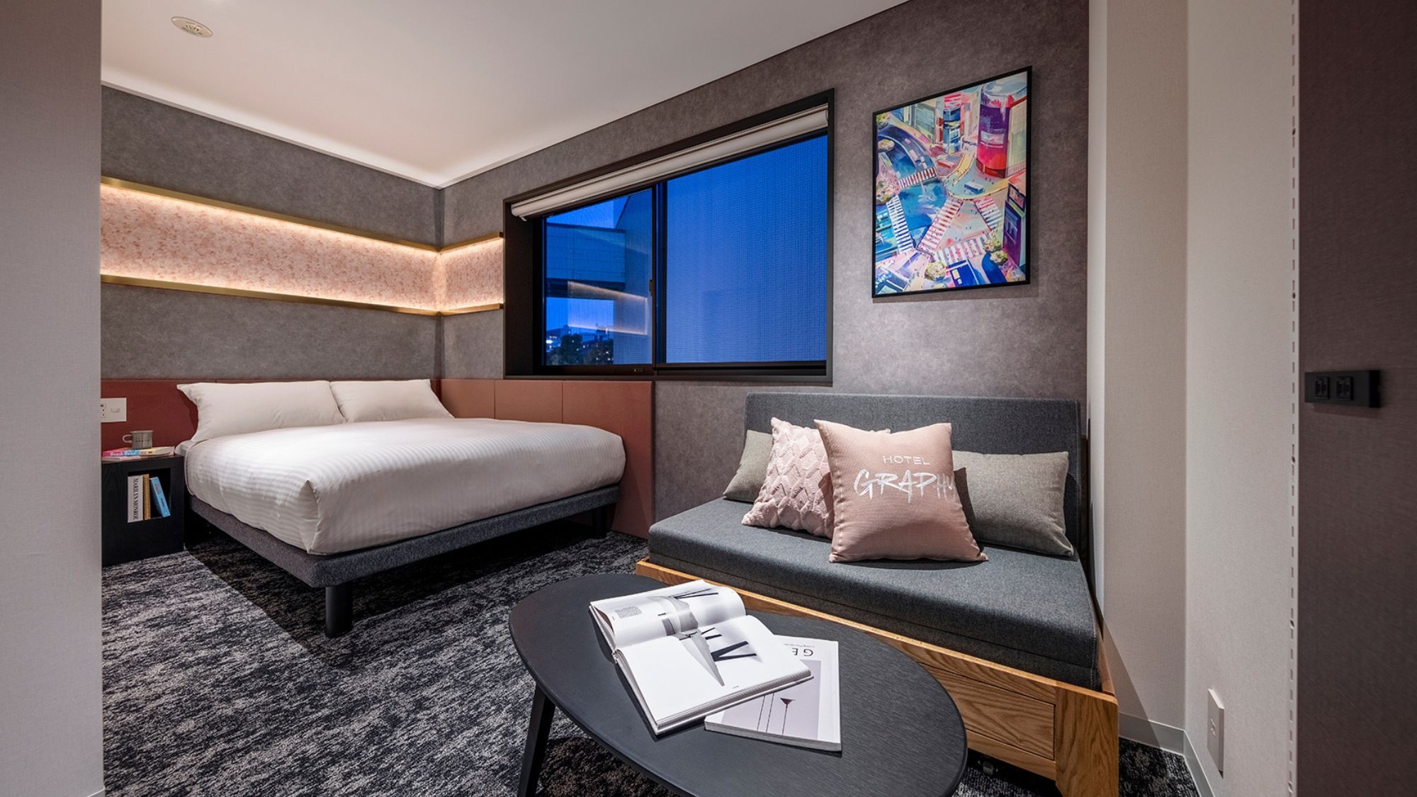 室内にバス・トイレのついた通常のホテルと同様の客室タイプです。幅140cmダブルベッド1台、ソファスペース付き。