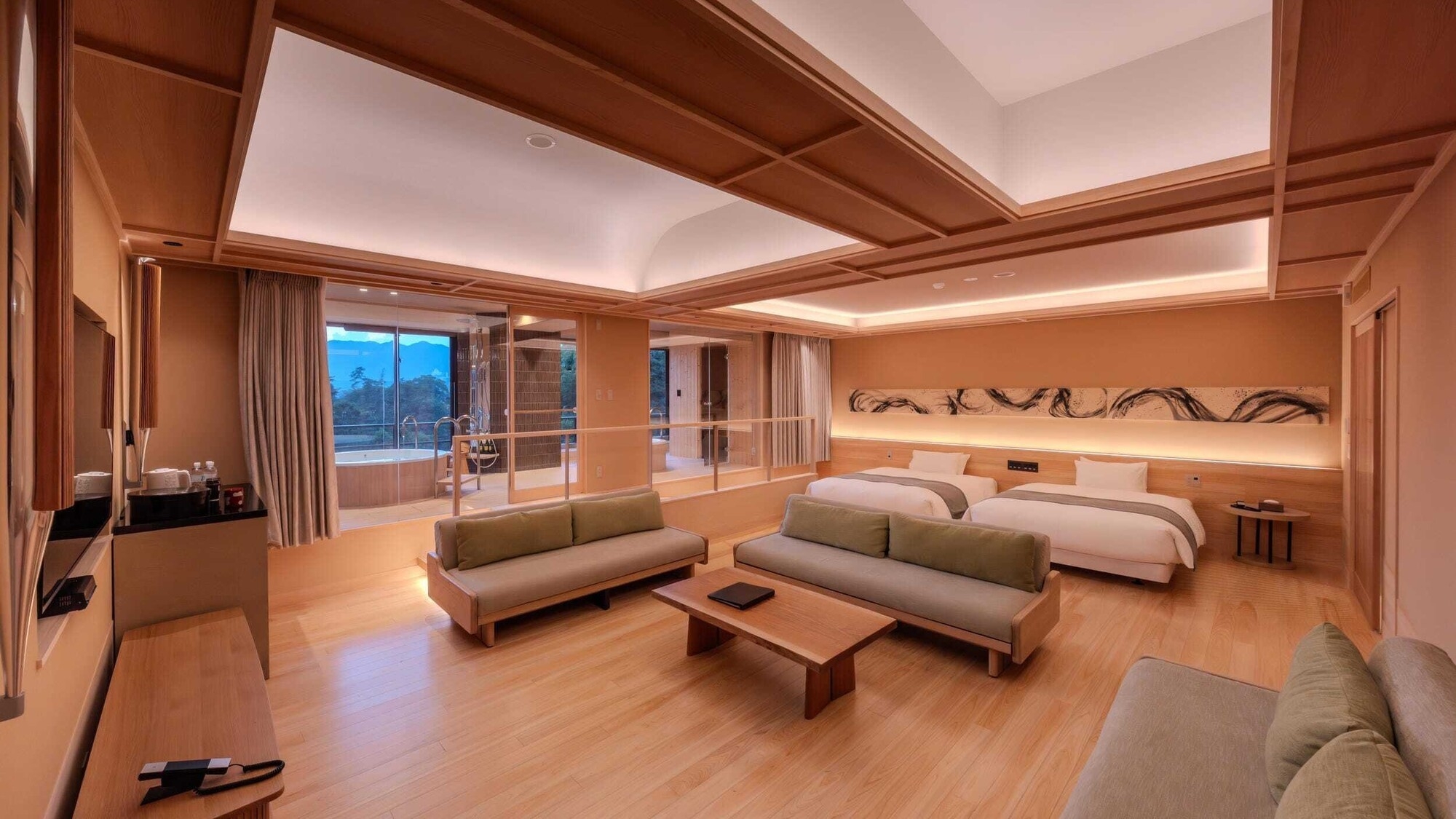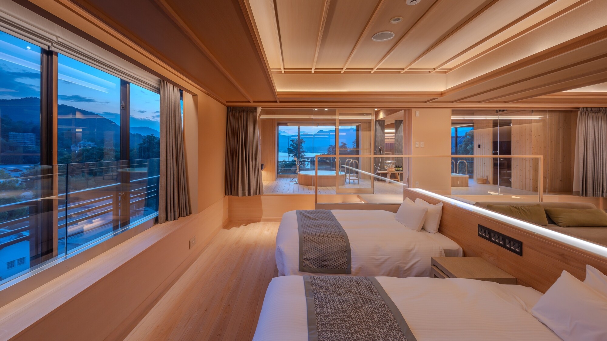 99平米/12帖の和室とツインベッドルームを組み合わせたデラックスルーム。ソファで寛ぐもよし、ベッドでゆったりするのもよし。広々とした窓から霊峰弥山を望めます。