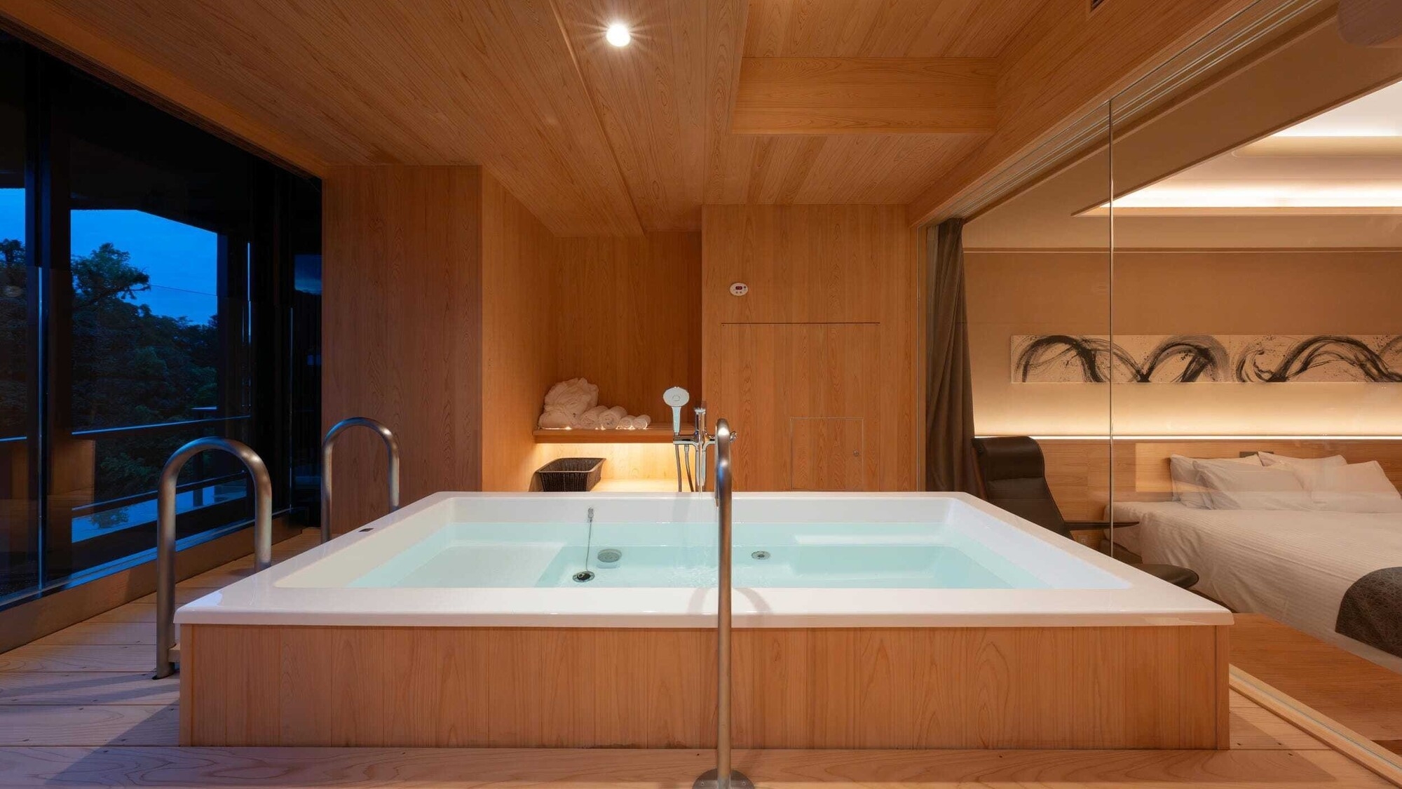 令和6年12月リニューアル、神社側の荘厳なライトアップの眺望をお楽しみいただけます。 檜の香りがほのかに漂う、神秘的な客室です 48平米 (内 半露天風呂