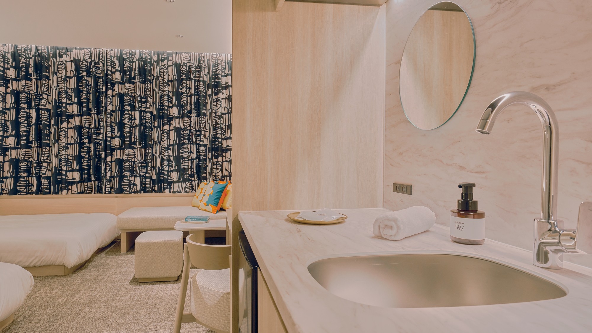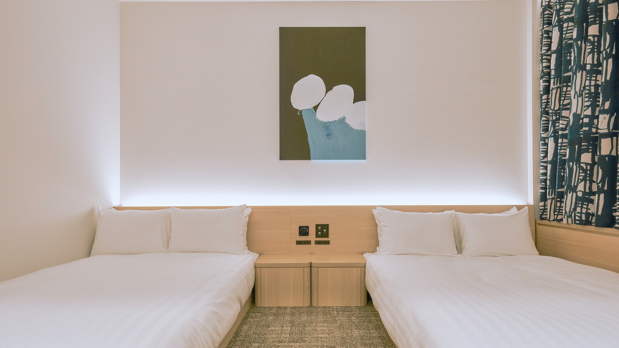 ヘラルボニーとのコラボコンセプトルーム 車椅子対応のバリアフリールーム SIMONS製マットレス使用 ダブルベッド1台 セミダブルベッド1台