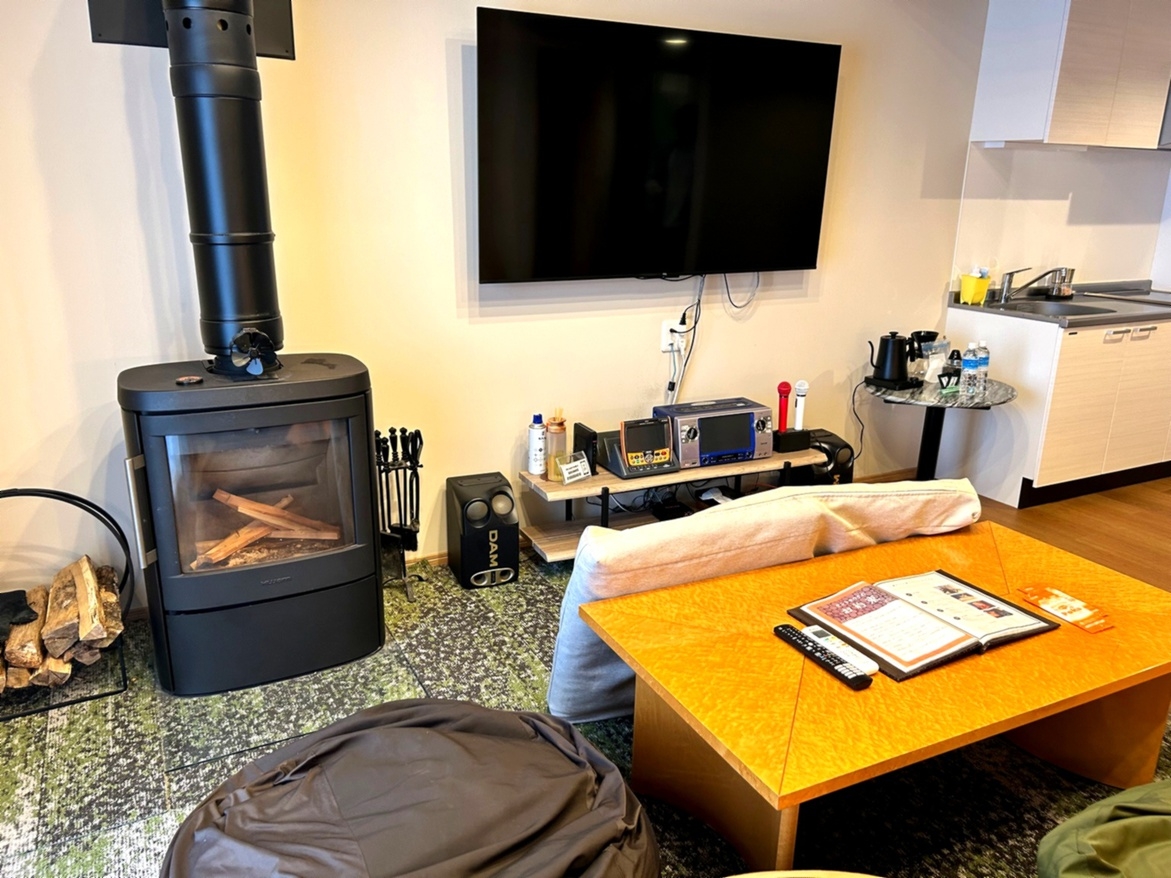リニューアル!カラオケや暖炉を備えた特別ルーム。プライベート薪テントサウナ&水風呂・BBQ付※露天風呂冬季使用不可。2段ベッド(クイーン1シングル2)