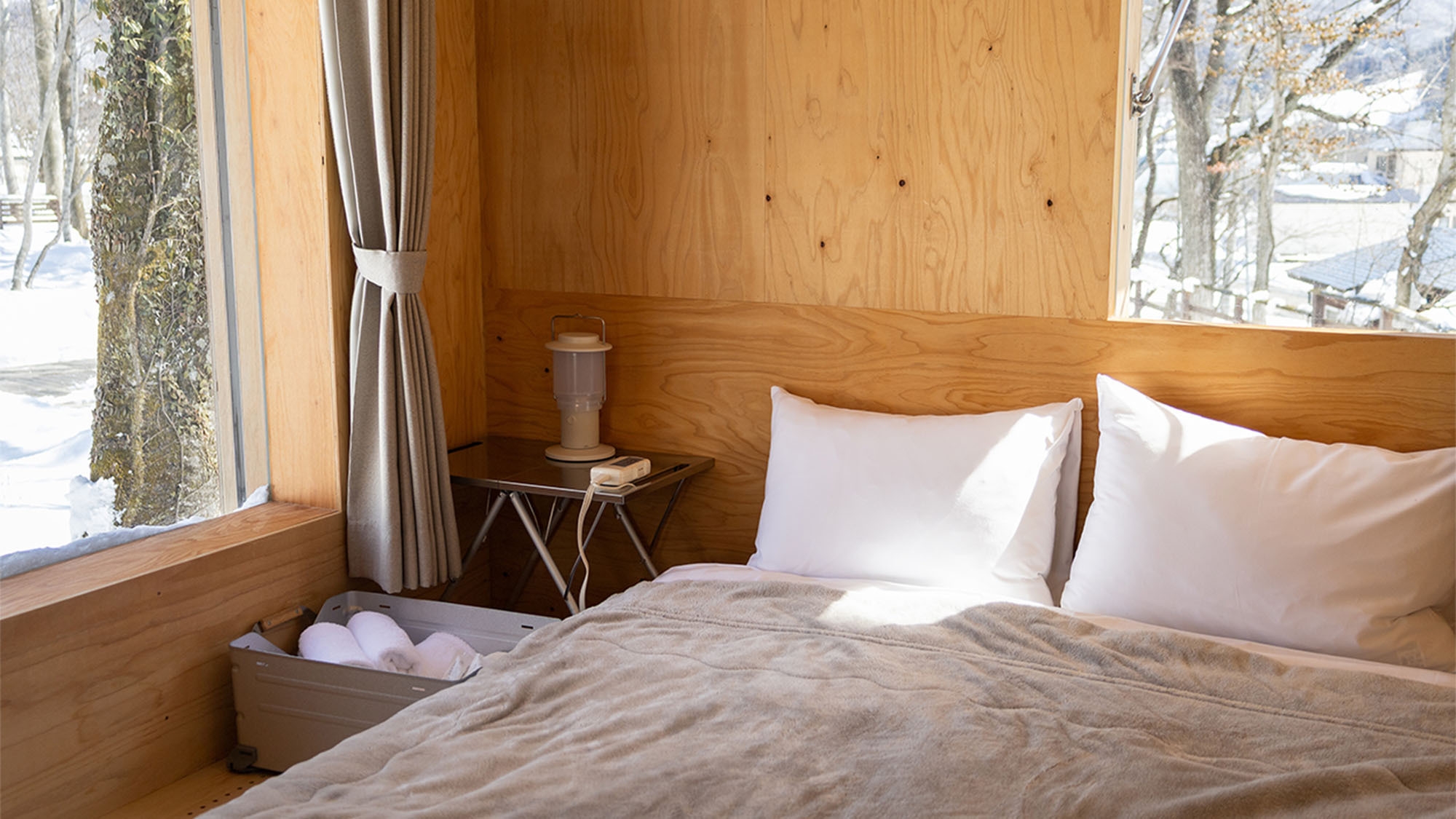 世界的な建築家・隈研吾氏とスノーピークのコラボレーションで創りだしたモバイルハウス(大人2名、小学生2名まで宿泊可。お子様がいらっしゃる場合は、シュラフ利用)