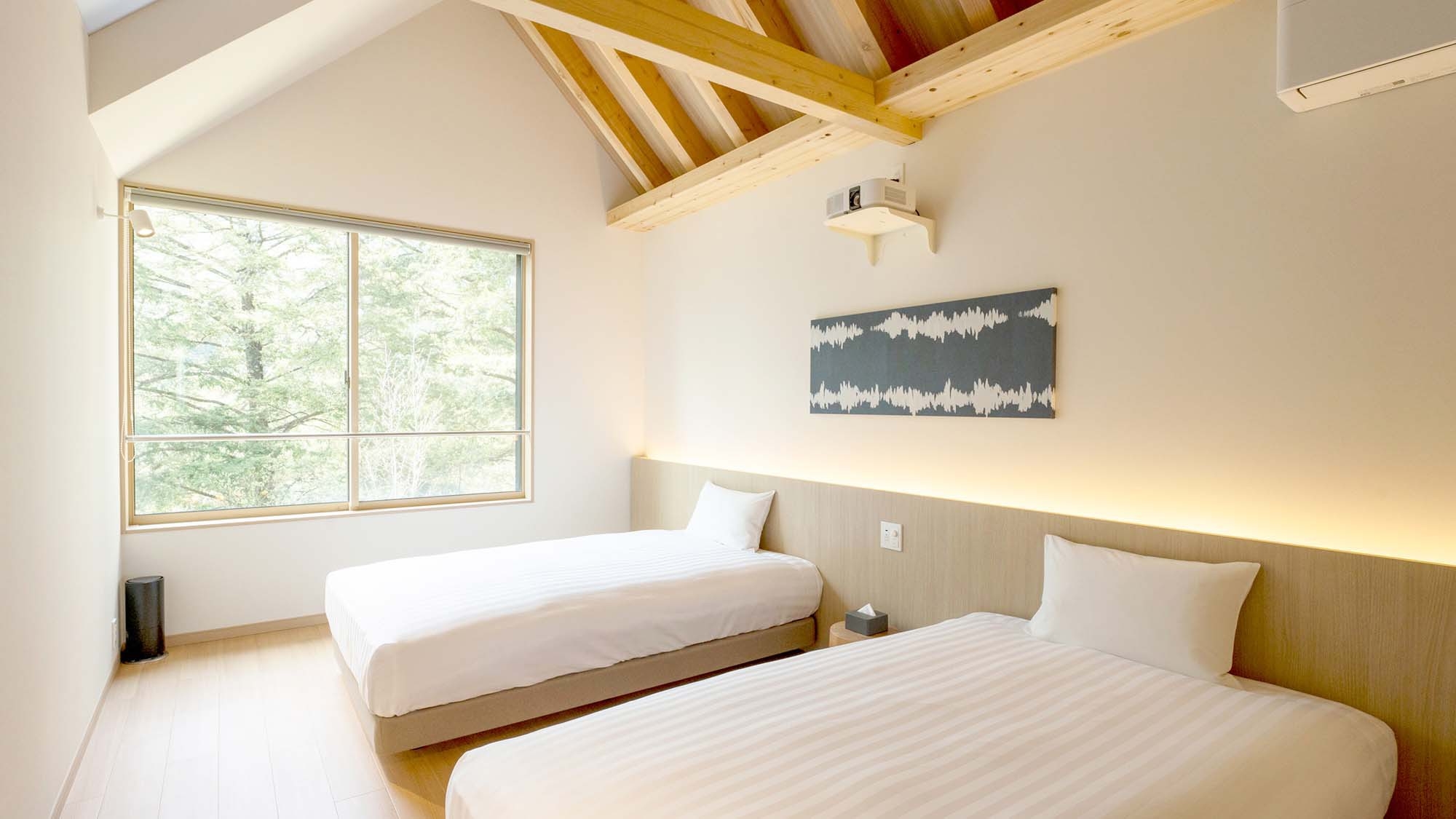 豊かな自然と調和した客室は、明るいインテリアと天井高を活かした開放的な空間