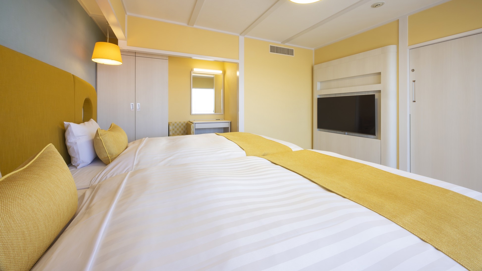 【2023年春リニューアル】バスタブからルーム越しに海景色を眺めることができる広めの洋室。セミダブルベッド2台+エキストラベッド2台を設置した客室です。