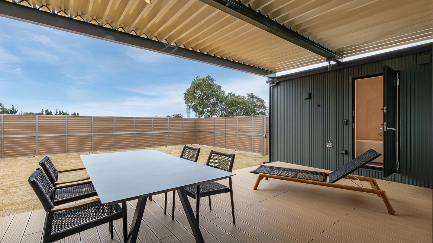 グリーンを基調とした客室にはドッグランも併設。【BBQプラン】ご予約でデッキにてBBQをお楽しみいただけます。デイベッドとスタッキングベッドで4名様まで利用可能