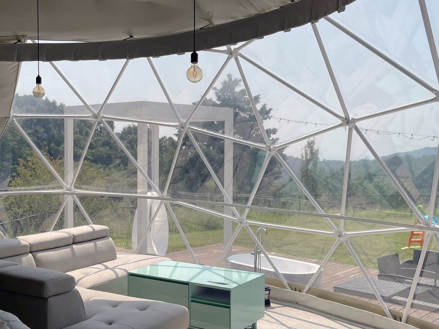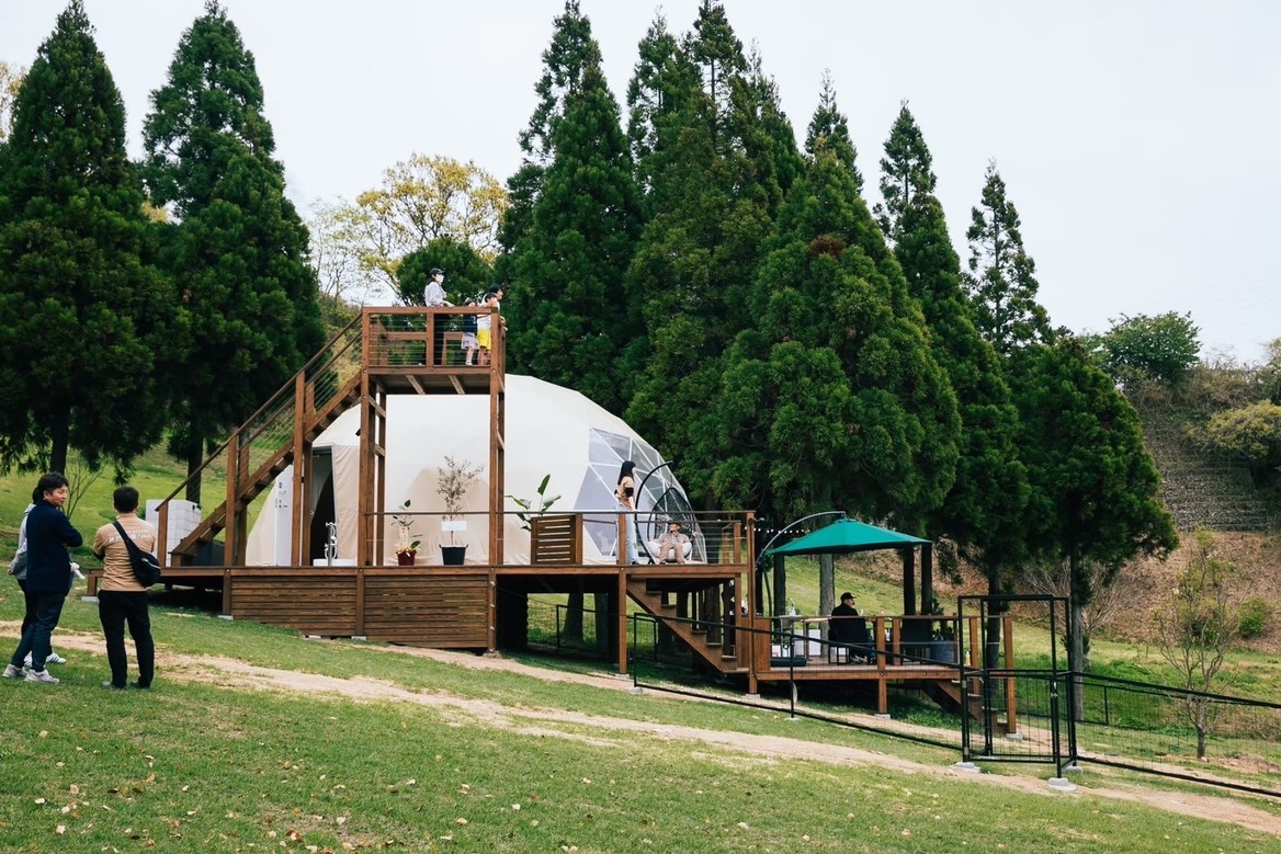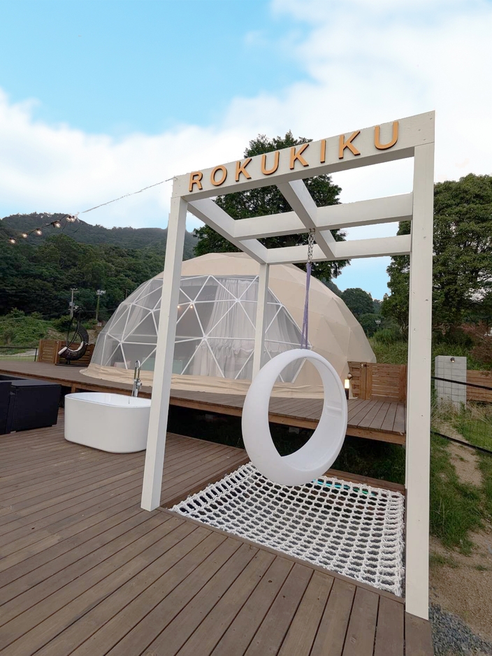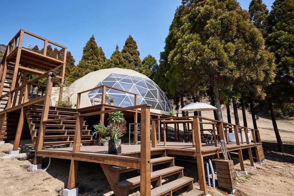 『傾斜地を活かした眺望性』ドームテント横の空へ続く階段を登った先からは 神戸の海を一望できます