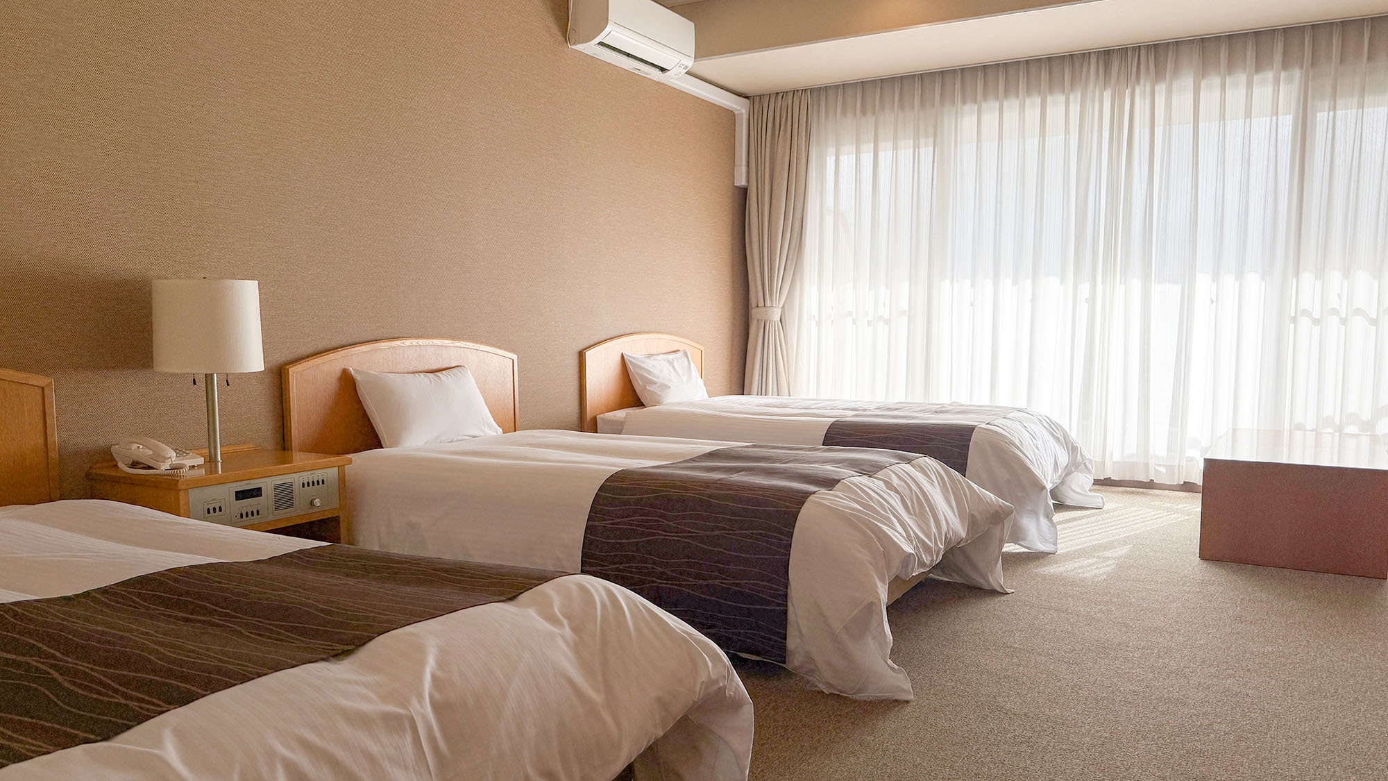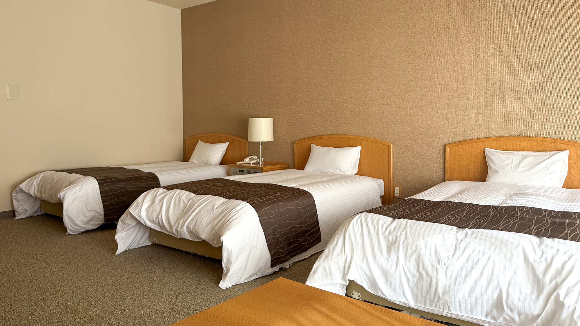 シングルベッド3台を設置したトリプルのお部屋。ご家族やお友達とのご旅行にちょうどいいお部屋でのんびりと広島旅をお過ごしいただけます。お部屋でも温泉を楽しめます。