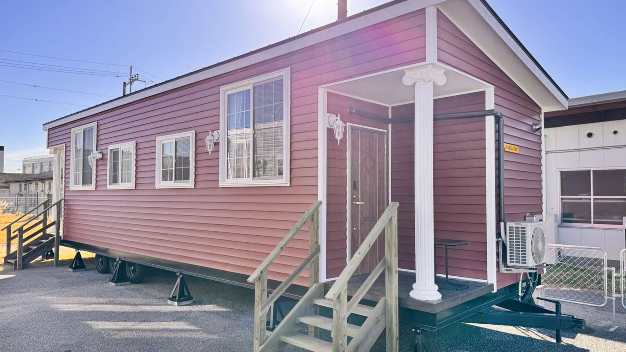 一台のトレーラーハウスに2部屋ございます。シングルベッド2台で、お風呂・トイレが一緒のユニットタイプになります。キッチン、ウッドデッキ、専用庭はございません。