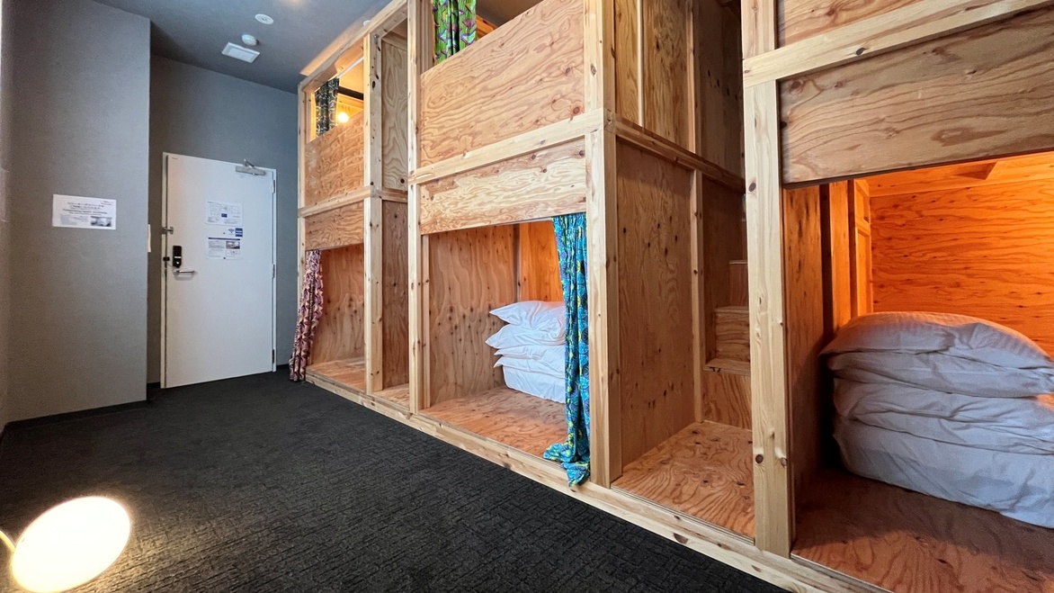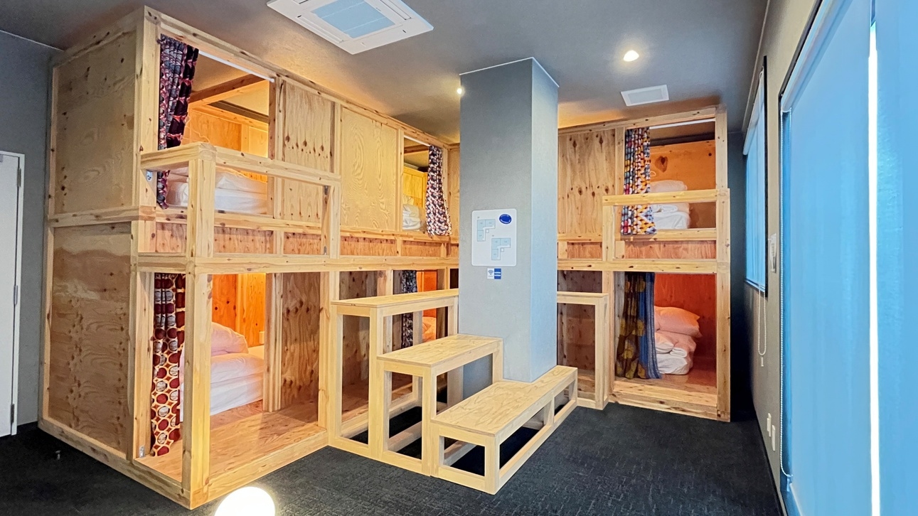 6名様まで宿泊可能なドミトリー貸切タイプのお部屋です。二段ベッドを3台設置しており、グループ旅行でもプライバシー空間を確保してご宿泊いただけます。