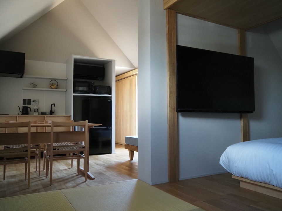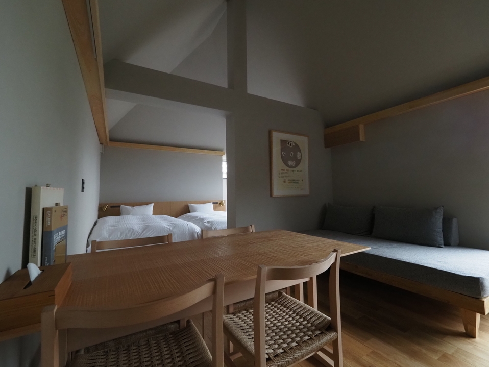 クイーンベッドルーム1台、敷布団1組、ソファベッド1台の最大4名様までご利用いただけます。キッチン・洗濯機付きで倉敷周辺の旅の滞在拠点としても最適です。