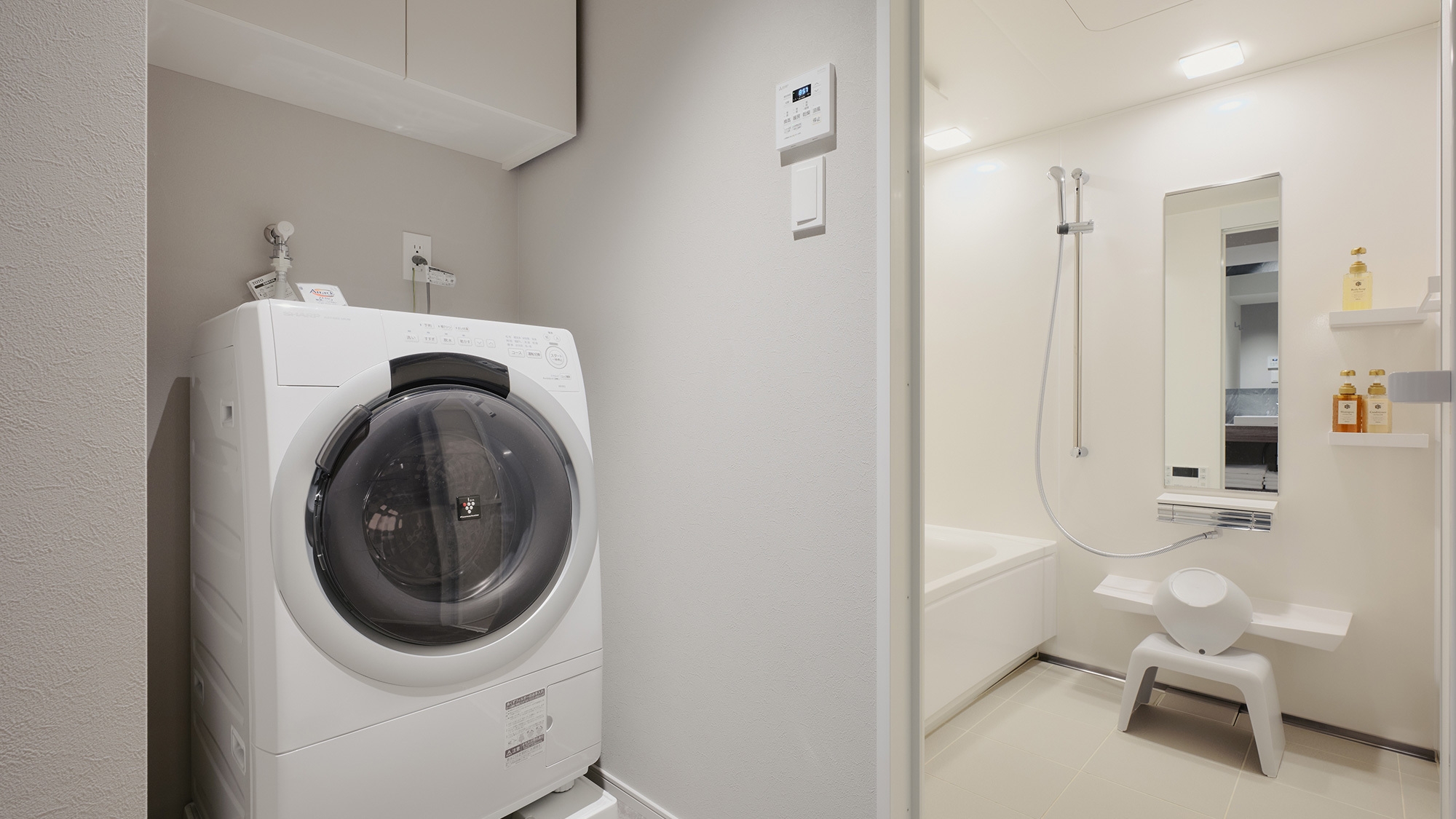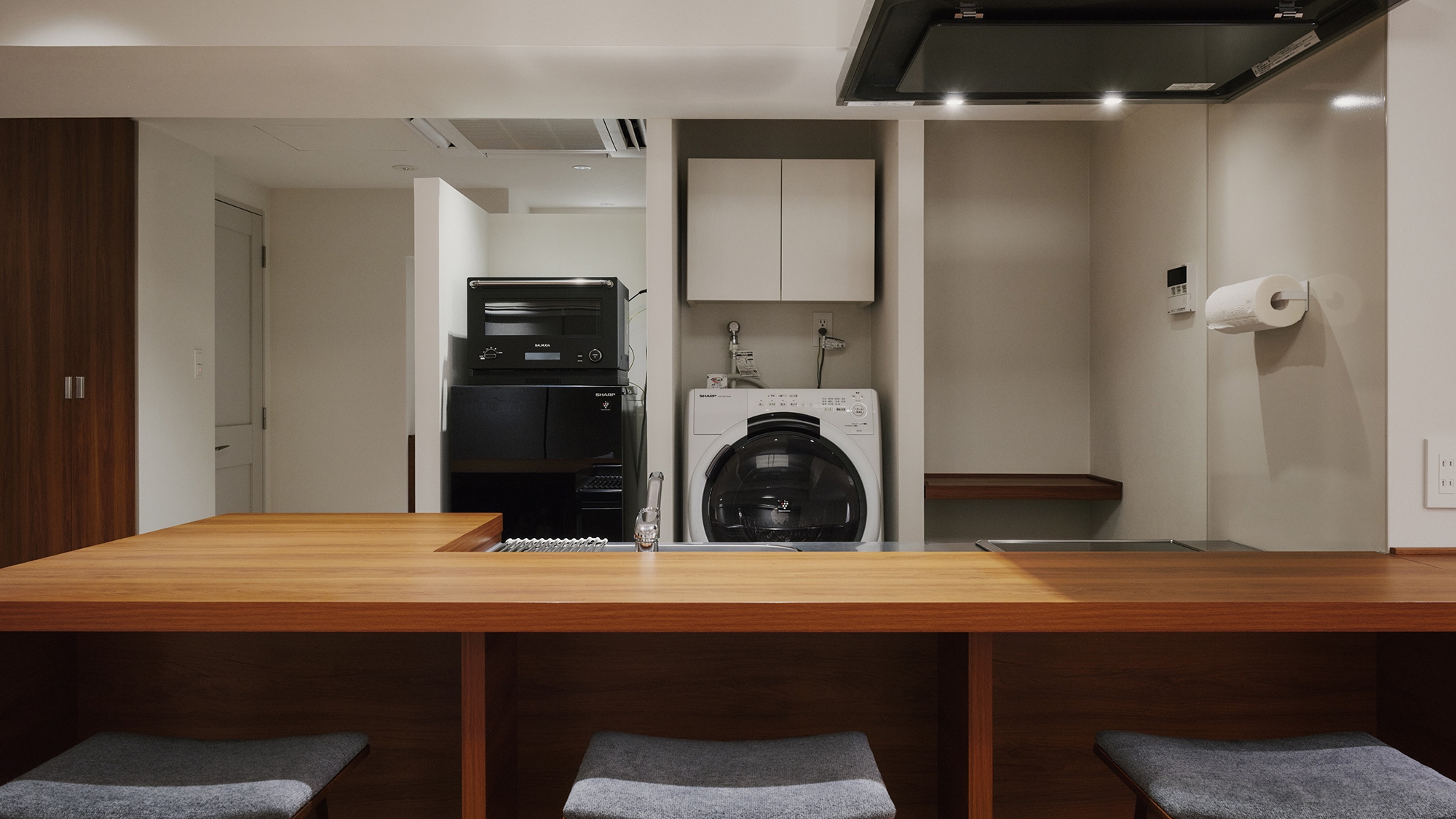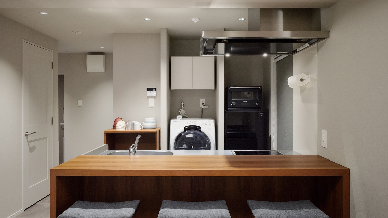 お部屋は全室に洗濯乾燥機、調理器具やキッチンが付き、ご家族・ご友人で、我が家のようにお寛ぎいただけます