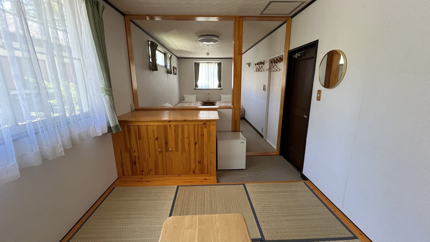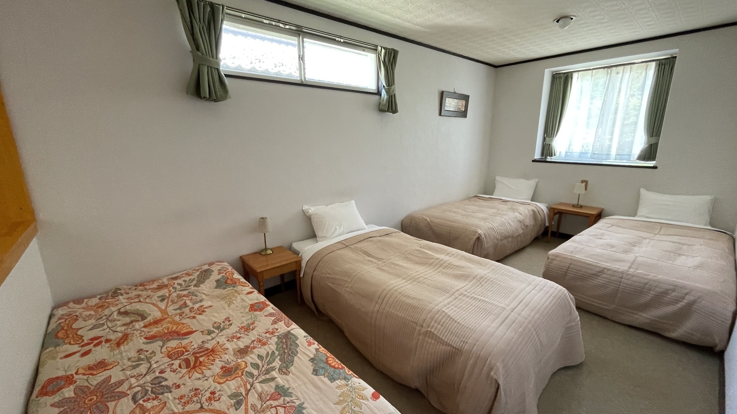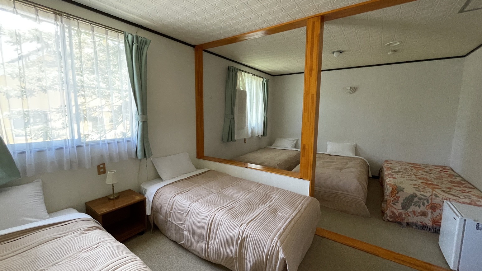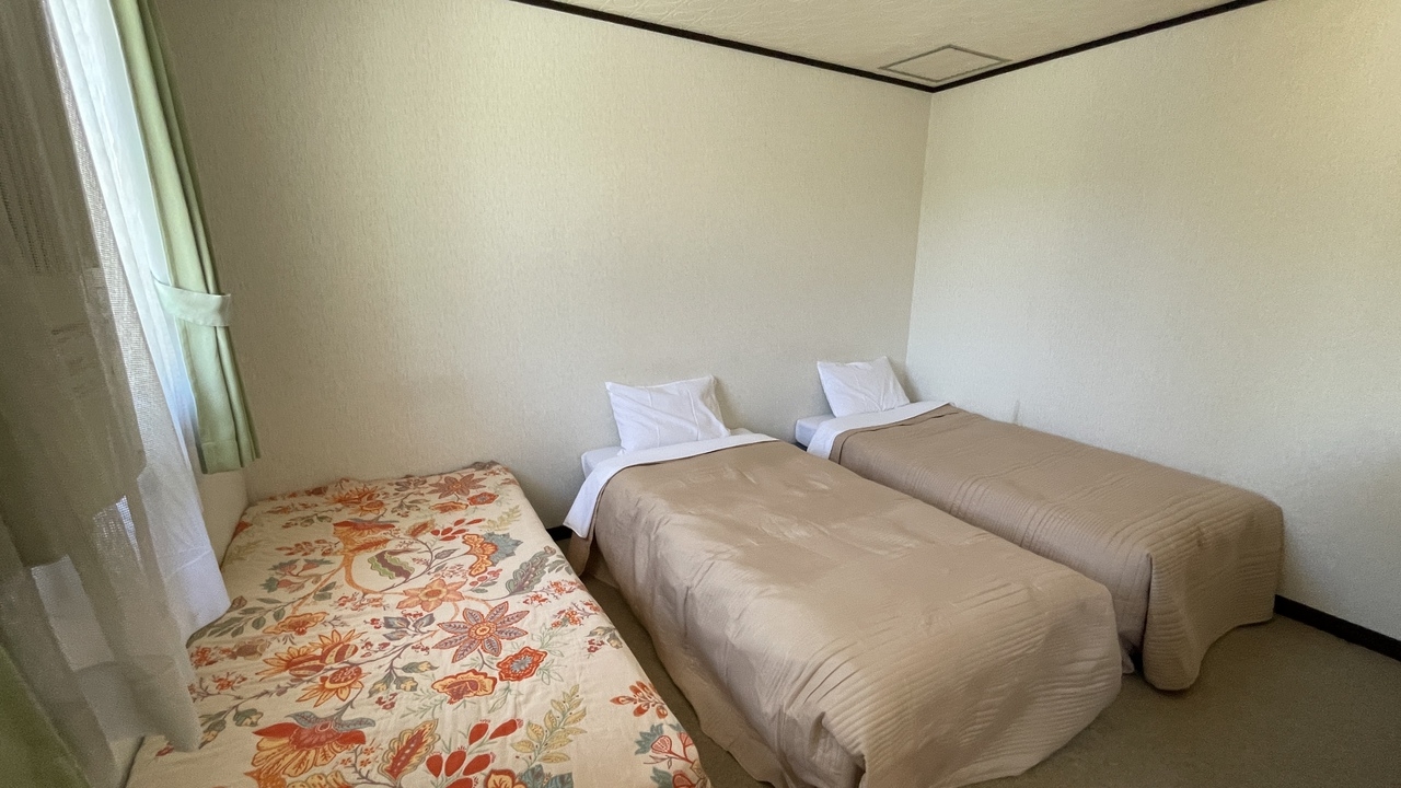 ベッドは3つ。和室にお布団を敷いて1名さま利用可能。1-4名さま向けのお部屋です。