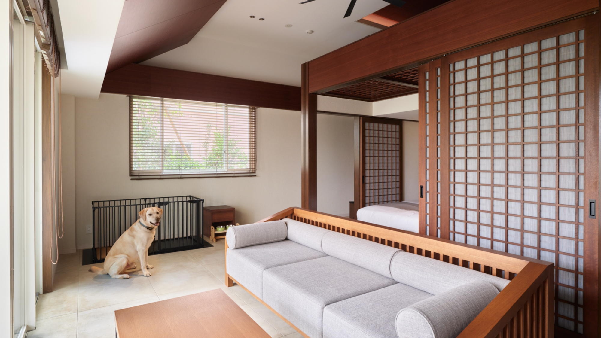 愛犬とご宿泊いただける総面積109平米の広々としたお部屋。55平米のゆったりとした開放的な専用テラスでは、大型犬ものびのびと寛げます。