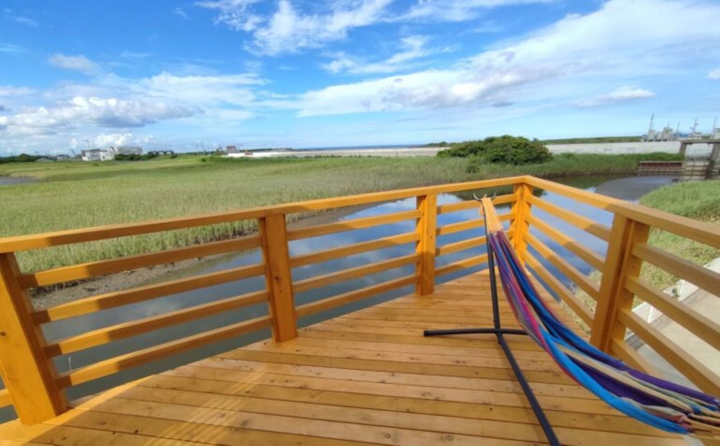 リバーサイドのデザイナーズハウスです。 2階のパティオからは海が見え、川沿いの裏庭ではバーベキューも楽しめます。 LDKは29.5畳あり、レッドシダーの天井は吹