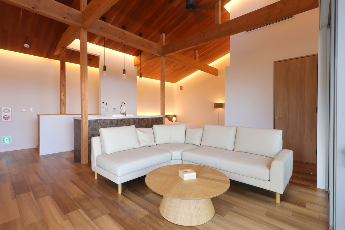 リビング、キッチン、ベッドルーム、半露天風呂、サウナ、洗面、トイレ