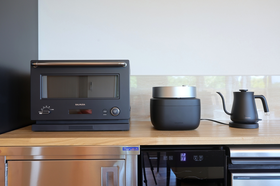 IH、ロースター、冷蔵庫、冷凍庫、電子レンジ、トースター、電気ケトル、調理器具一式、食器類、洗剤、スポンジなど